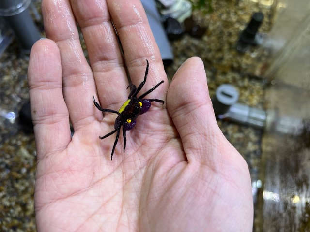 当店オリジナル直輸入便で入荷したハロウィンバンパイアクラブです。現在のサイズは甲長1-2cm。 【飼育難易度】 容易 【エサ】 冷凍赤虫、カニザリガニ用人工飼料 【水温】 24-25度 【水質】 中性 【最大サイズ】 甲長2-3cm 【混泳】 同種同士の複数飼育は可能 【コメント】 インドネシア産の淡水ガニです。20種類以上存在し、カラフルな体色とコミカルな動きから非常に人気が高い種類です。同種同士の複数飼育も比較的容易で、飼育下での繁殖も楽しめます。基本的に陸上での活動が多いですが、水がないと呼吸できなくなるため、必ず水場は設置してください。また、空腹時は共食いをしてしまう事があるのでエサ切れにも注意してください。オス個体1匹の販売です。 ◆死着補償は行なっておりません。予めご了承ください。 ◆野生採集個体です。キズや数本の足欠けはご容赦ください。 ◆画像は販売個体を撮影したサンプルです。お送りする個体とは異なる場合があります。