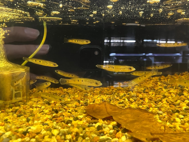 当店オリジナル直輸入便で入荷したKalyptatherina・helodesです。現在のサイズは4-5cm。 【飼育難易度】 容易 【エサ】 フレークフード、冷凍赤虫 【水温】 24-25度 【水質】 中性 【最大サイズ】 7-8cm? 【混泳】 口に入らないサイズの魚との混泳は可能 【コメント】 Kalyptatherina helodes インドネシアに生息するレインボーフィッシュの一種です。英名でセルフィンシルバーサイドレインボーフィッシュとも呼ばれます。以前は単にイエローレインボーフィッシュとして流通していた事もありますが、イエローレインボーフィッシュとして流通する魚には何種類かおり、本種含めほとんど輸入される事のない稀種です。婚姻色の出たオスは各ヒレが鮮やかなイエローに染まり美しくなります。サイズが小さいためオスメスの判別は不可。 ◆死着補償は行なっておりません。予めご了承ください。 ◆野生採集個体です。キズやヒレ裂け、欠けがある場合があります。 ◆画像は販売個体を撮影したサンプルです。お送りする個体とは異なる場合があります。