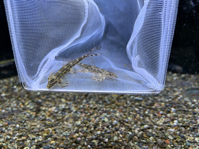 当店オリジナル直輸入便で入荷したアフリカンジャイアントマッドスキッパーです。現在のサイズは7-8cm。 【飼育難易度】 普通 【エサ】 カーニバル、冷凍赤虫、クリル 【水温】 24-25度 【水質】 中性〜弱アルカリ性 【最大サイズ】 15-20cm 【混泳】 不可、テリトリー意識が強いため単独飼育推奨 【コメント】 ナイジェリアに生息する大型トビハゼの一種です。婚姻色を発したオスは背ビレが鮮やかなブルーに彩られ美しくなります。基本的な飼育方法や環境は他のマッドスキッパーに準じます。汽水域に生息するため飼育には若干の塩分が必要です。テリトリー意識が非常に強く、特にオス同士は激しいケンカをするため単独飼育推奨です。現地では30cm近い個体も捕獲されており食用魚としても利用されます。 ◆死着補償は行なっておりません。予めご了承ください。 ◆野生採集個体です。キズやヒレ裂け、欠けがある場合があります。 ◆画像は販売個体を撮影したサンプルです。お送りする個体とは異なる場合があります。