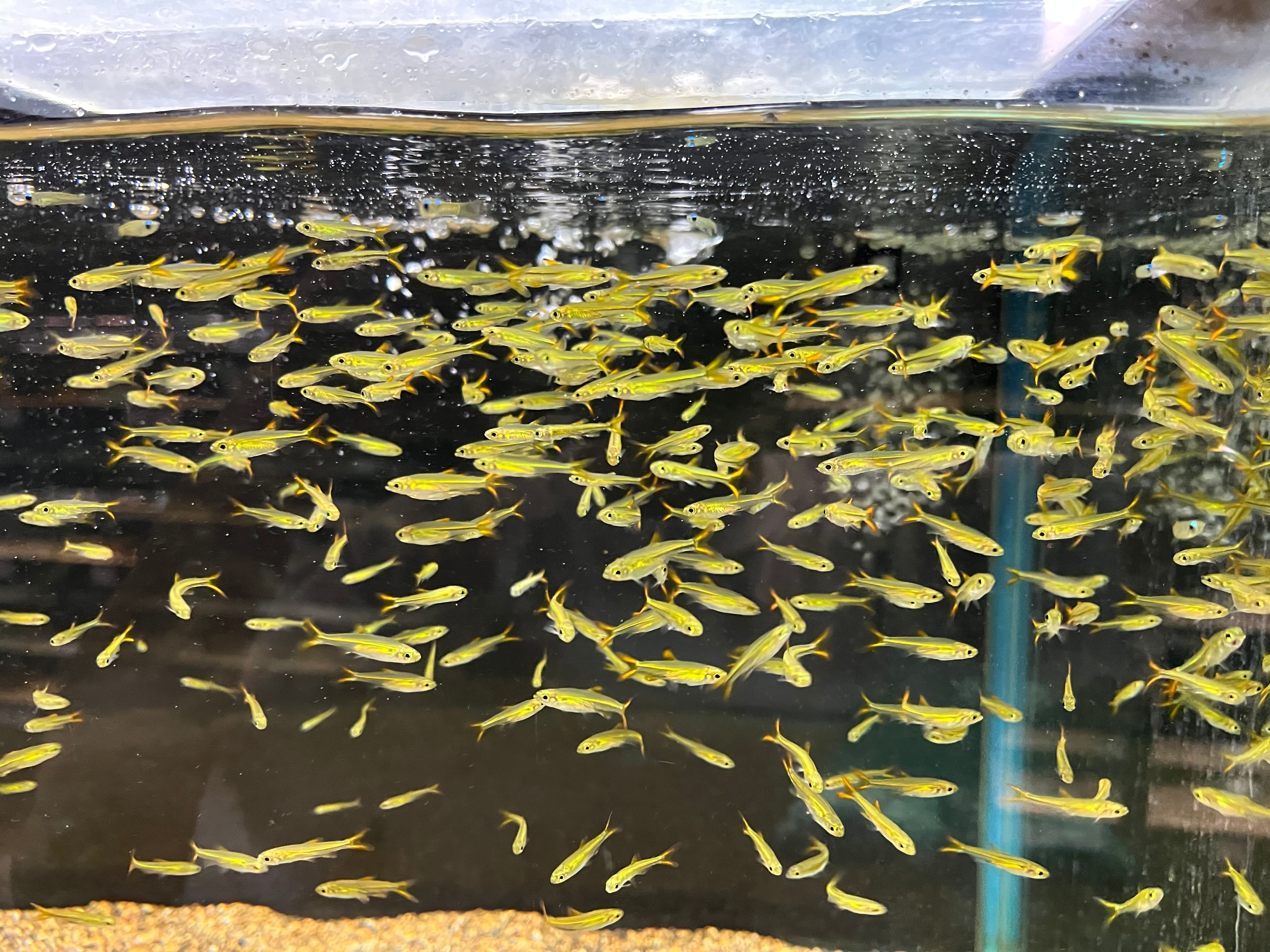 飼育は容易でエサはフレークフードを与えています。飼育下では2-3cmに成長します。