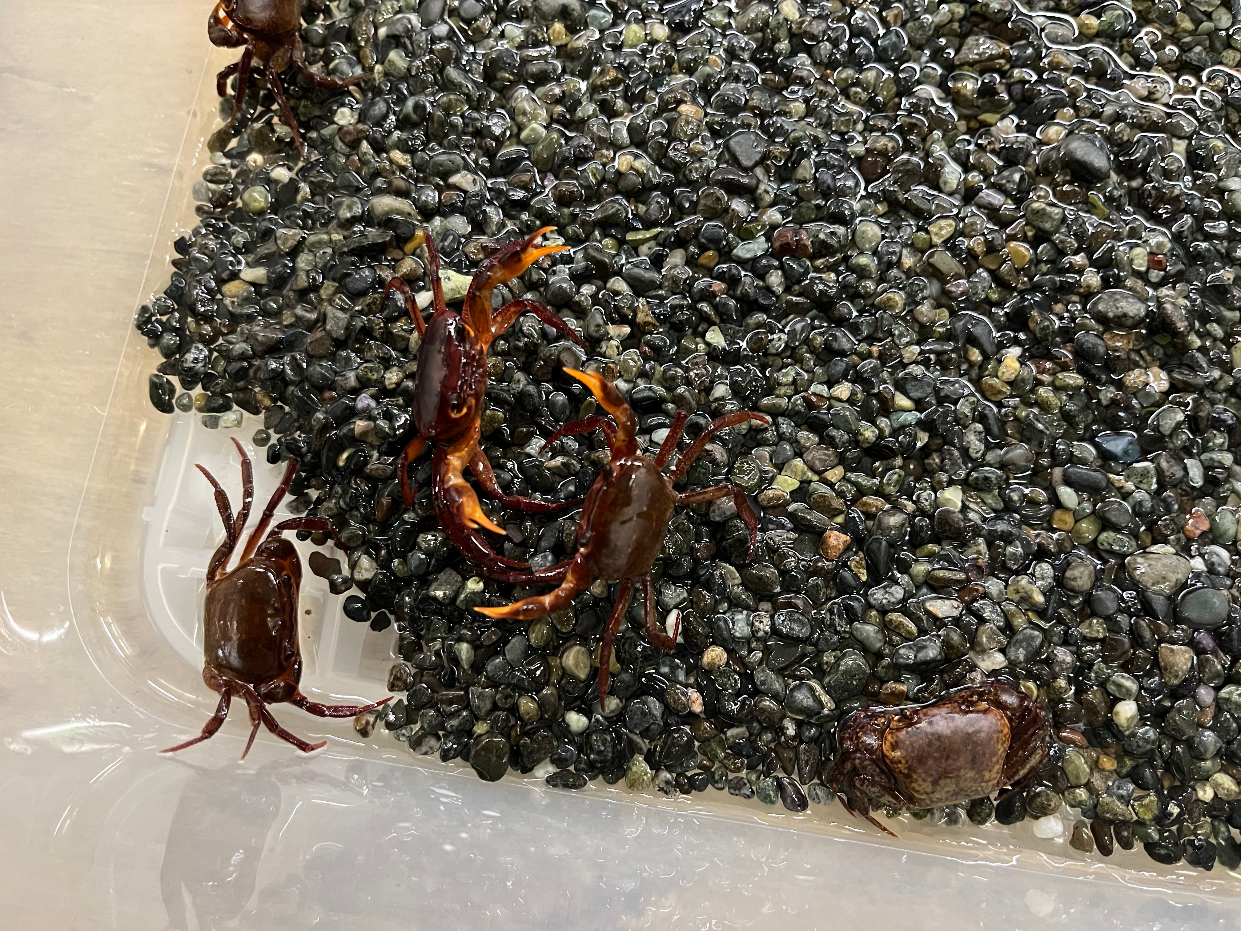 インドで比較的最近見つかったGhatiana属の一種と思われるカニです。全身ルビーの様に赤く染まる非常に美しいカニで、オスは片方のハサミが大きくなります。性格は悪くなく同種同士の複数飼育も可能ですが、空腹時は共食いをしてしまう事があるのでエサ切れには十分注意してください。