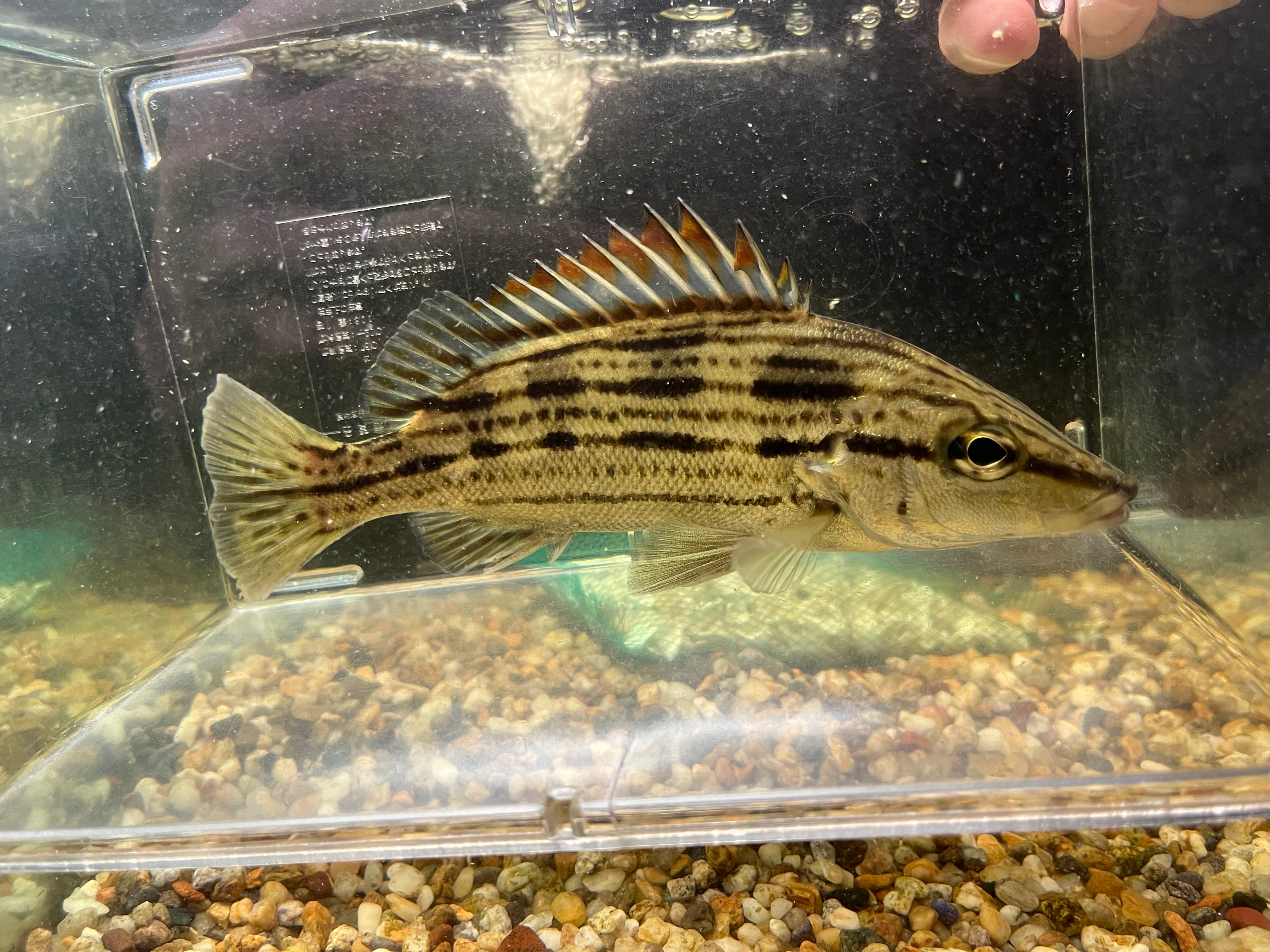 河口から内湾に生息している魚。食用にもされます。西太平洋に広く見られる魚ですが、今回は四万十川汽水域で採集されましたが、現在店頭では0.2〜0.4%の塩分を加えて管理しています。