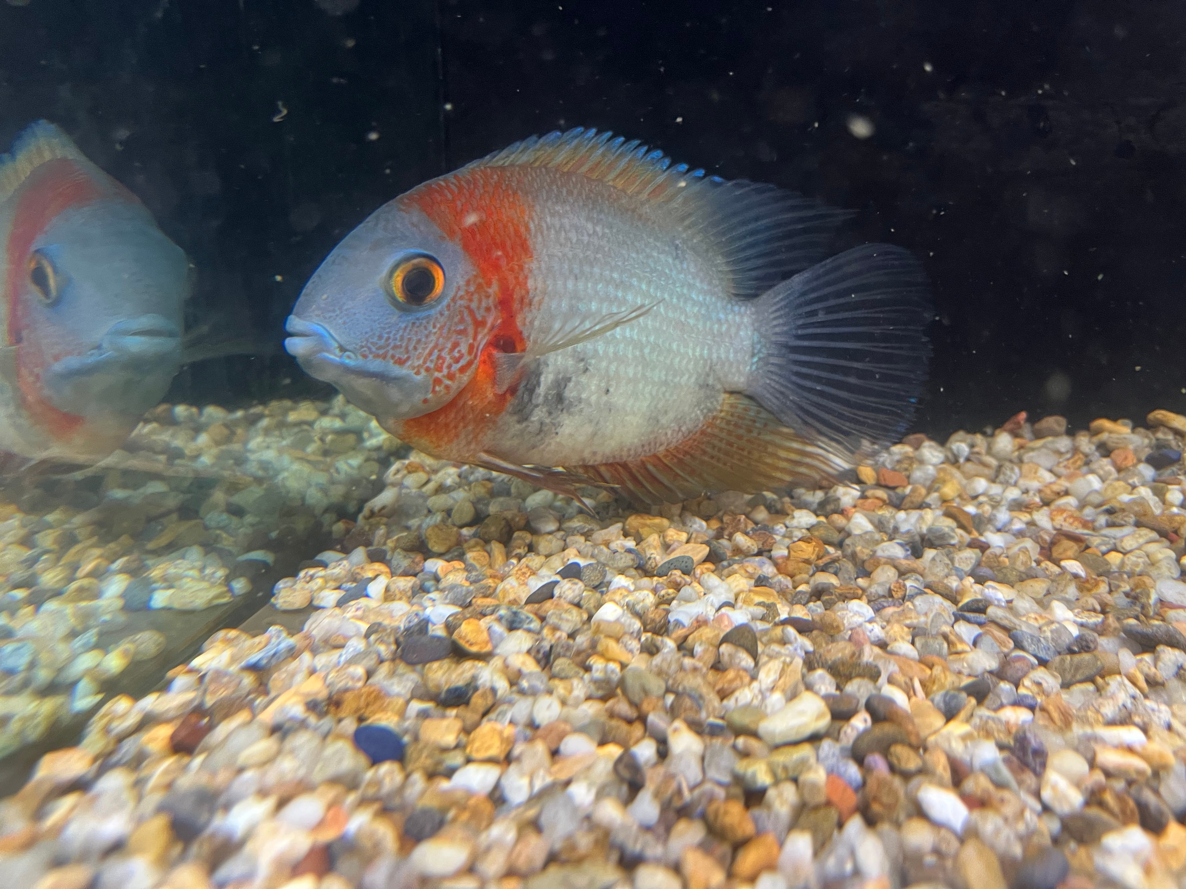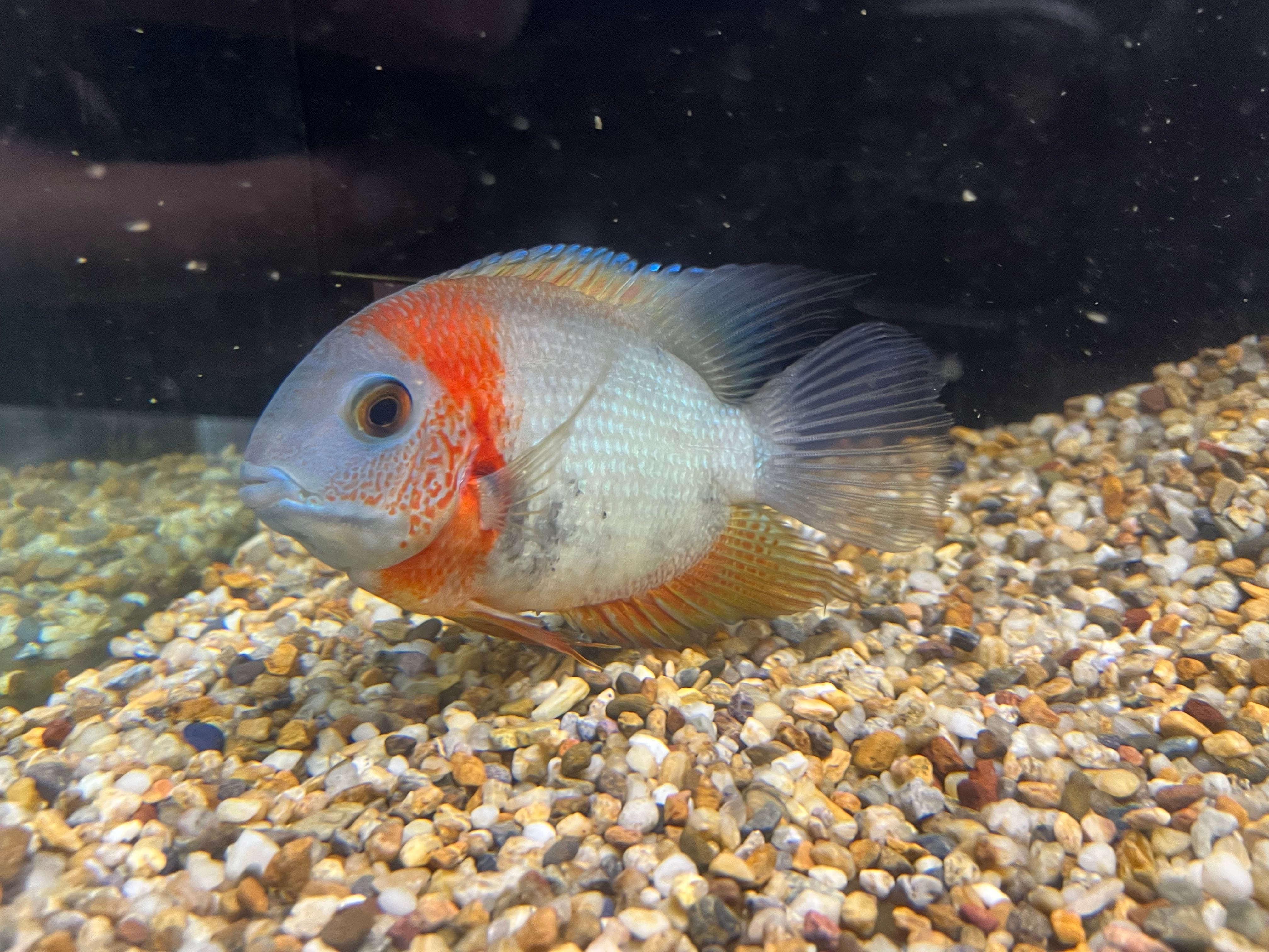 ペルー便で輸入されたペルビアンマルチカラーセベラムです。肩から腹にかけて入るレッドショルダーはじめ、複雑な色合いが美しい中型シクリッドです。