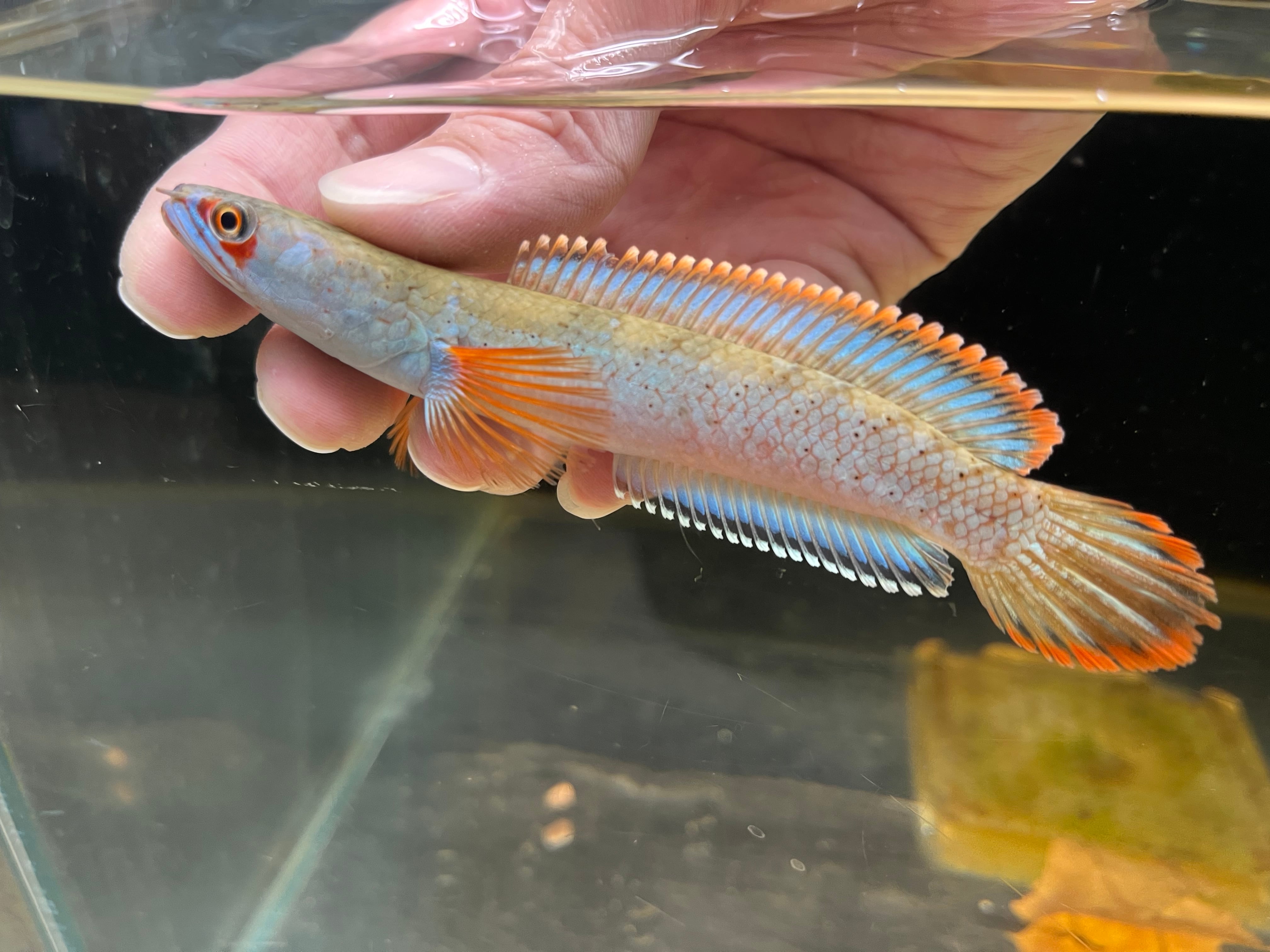 ミャンマーに生息するスネークヘッドです。目の周りからボディに入るメタリックブルーやヒレのオレンジエッジが美しく絶大な人気を誇るスネークヘッドです。また眼の周りに入る赤い模様がカブキ役者の隈取に見えることからカブキの流通名もあります。発見から長らくsp種として扱われてきましが、近年の研究で学名が付与され現在はチャンナフィロフタルムスと定義されています。