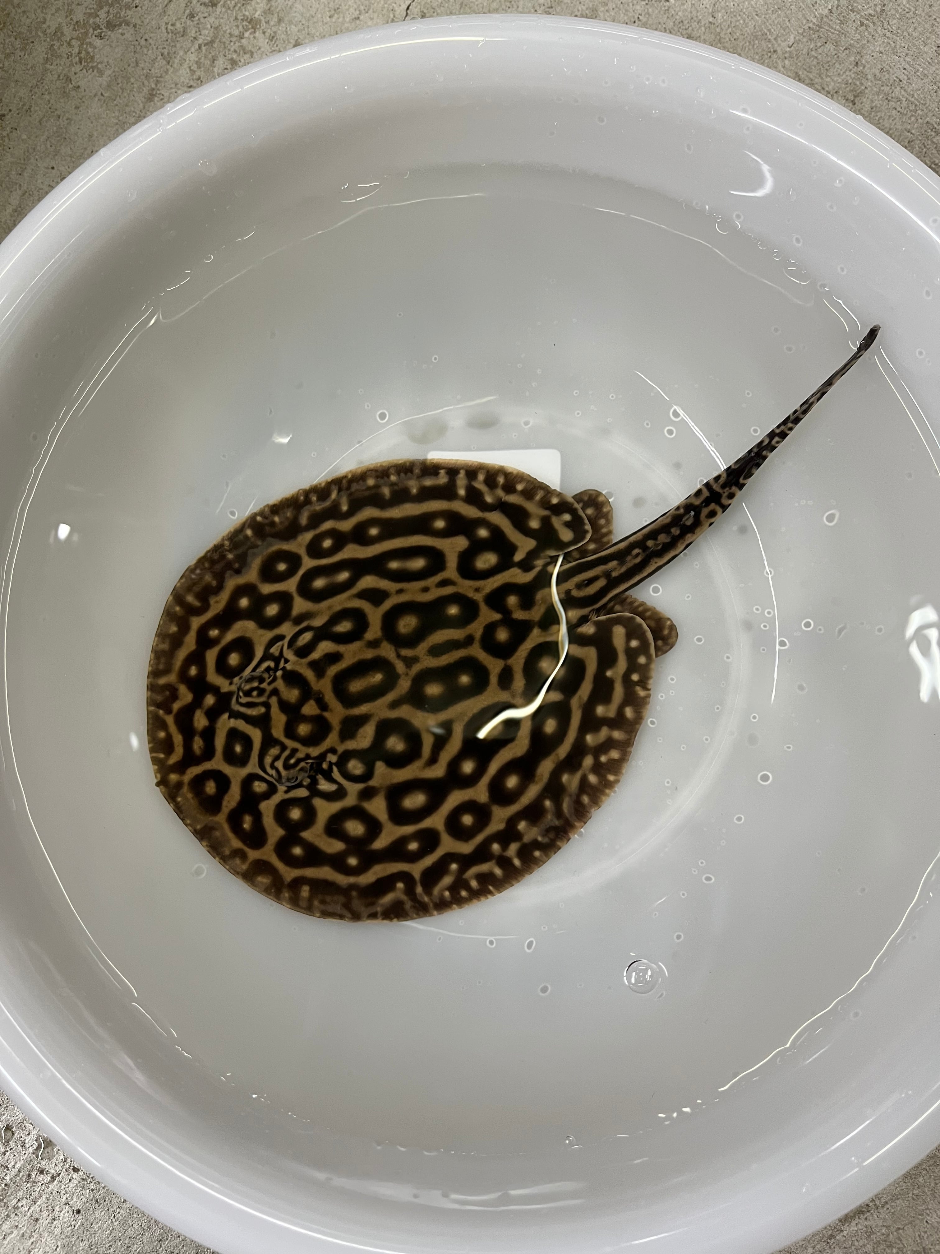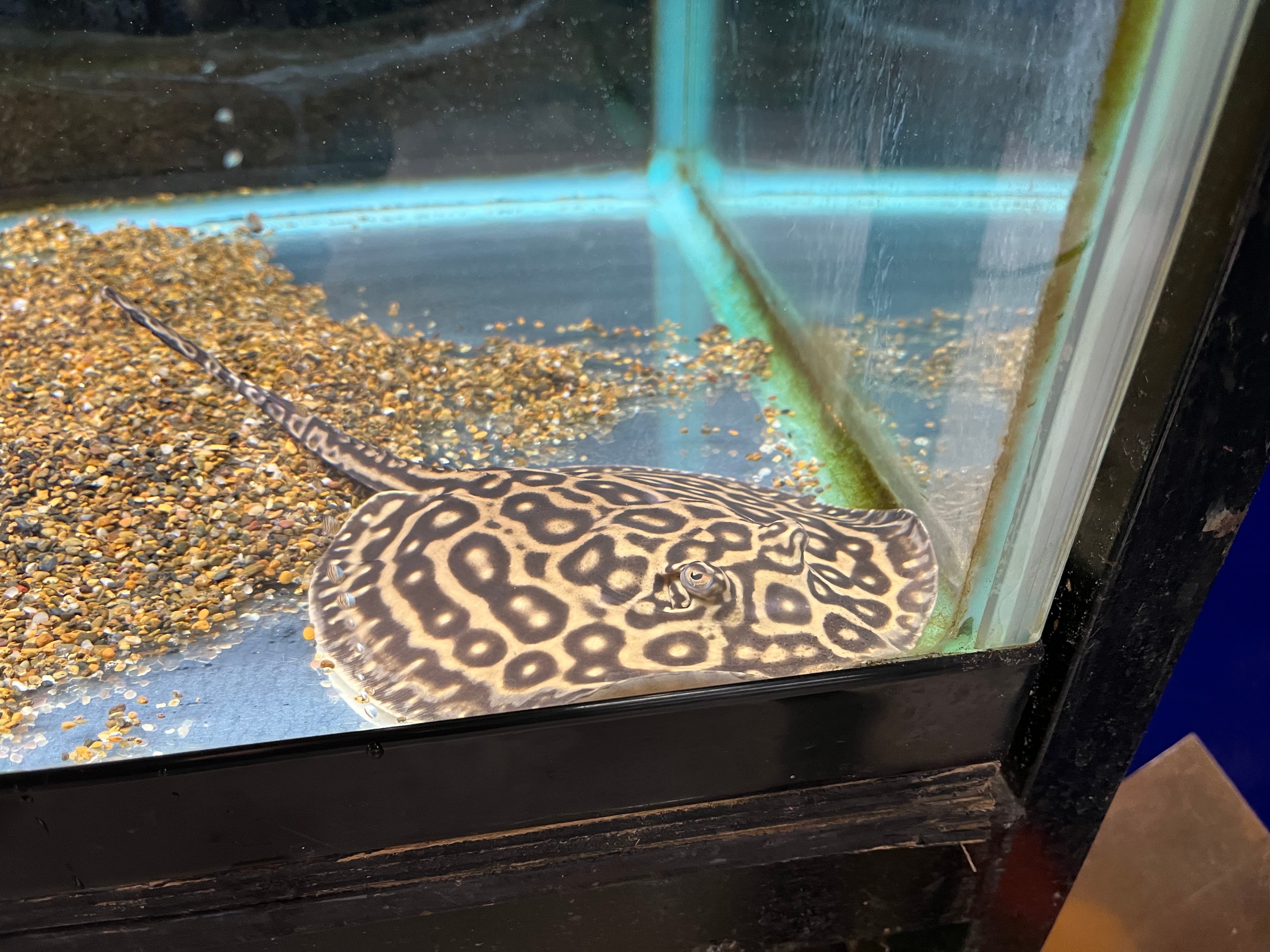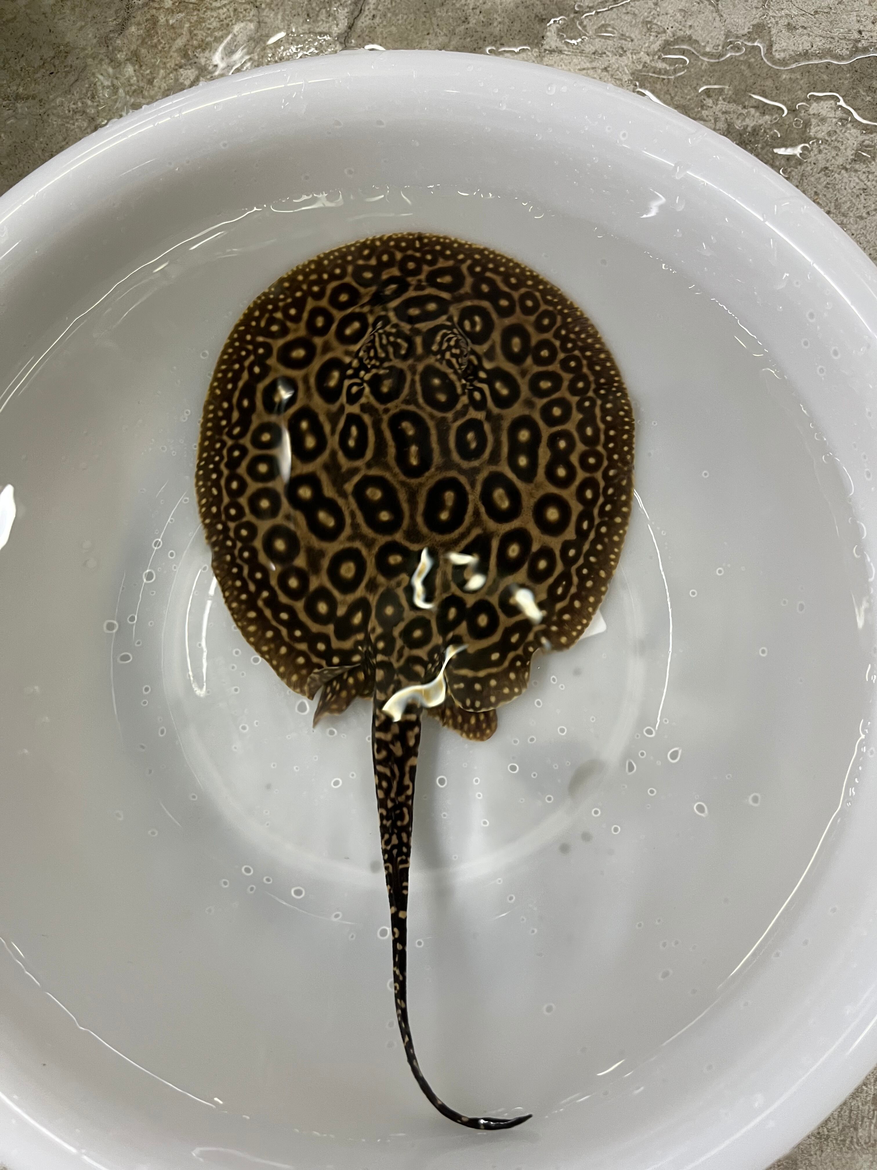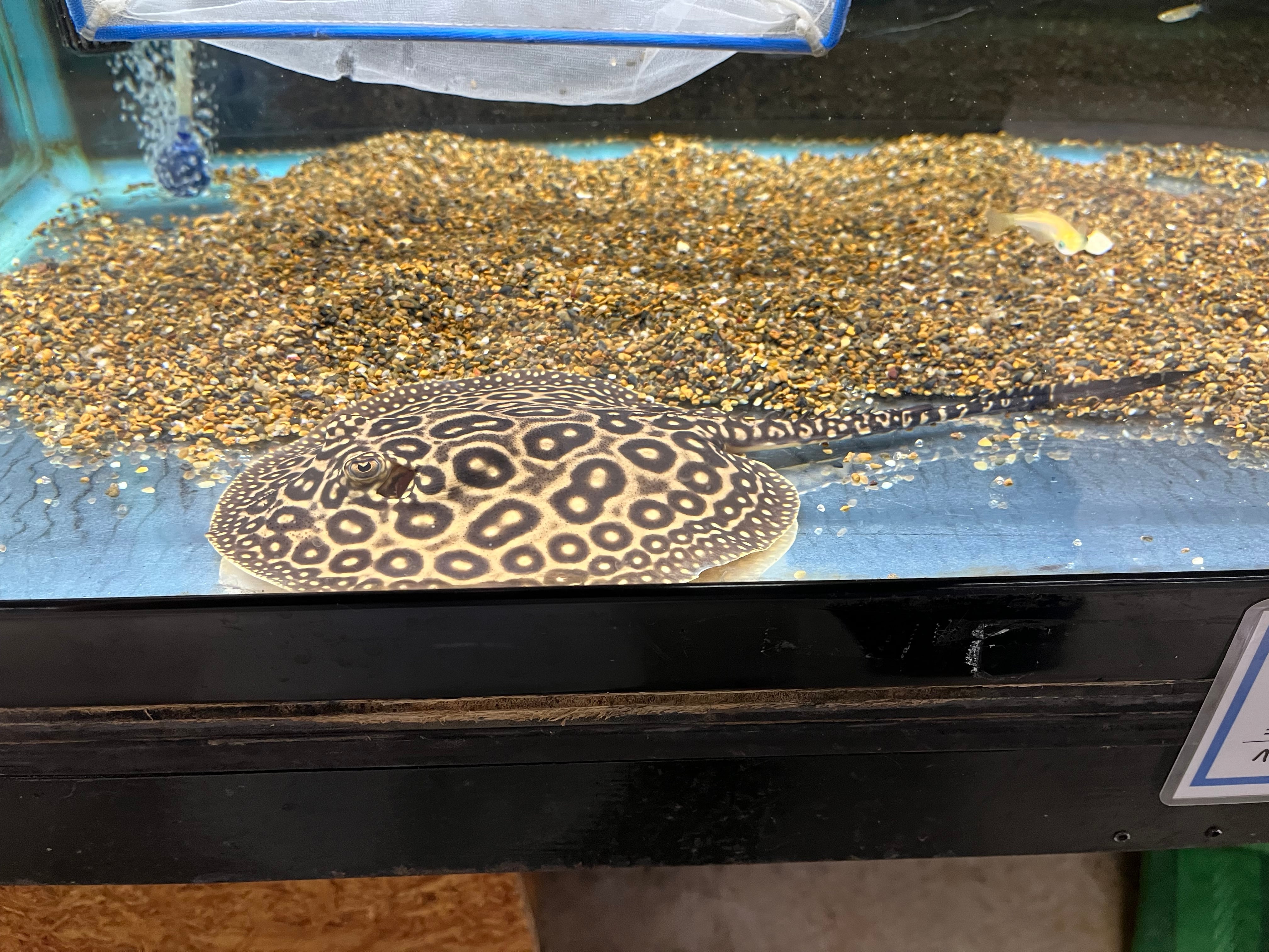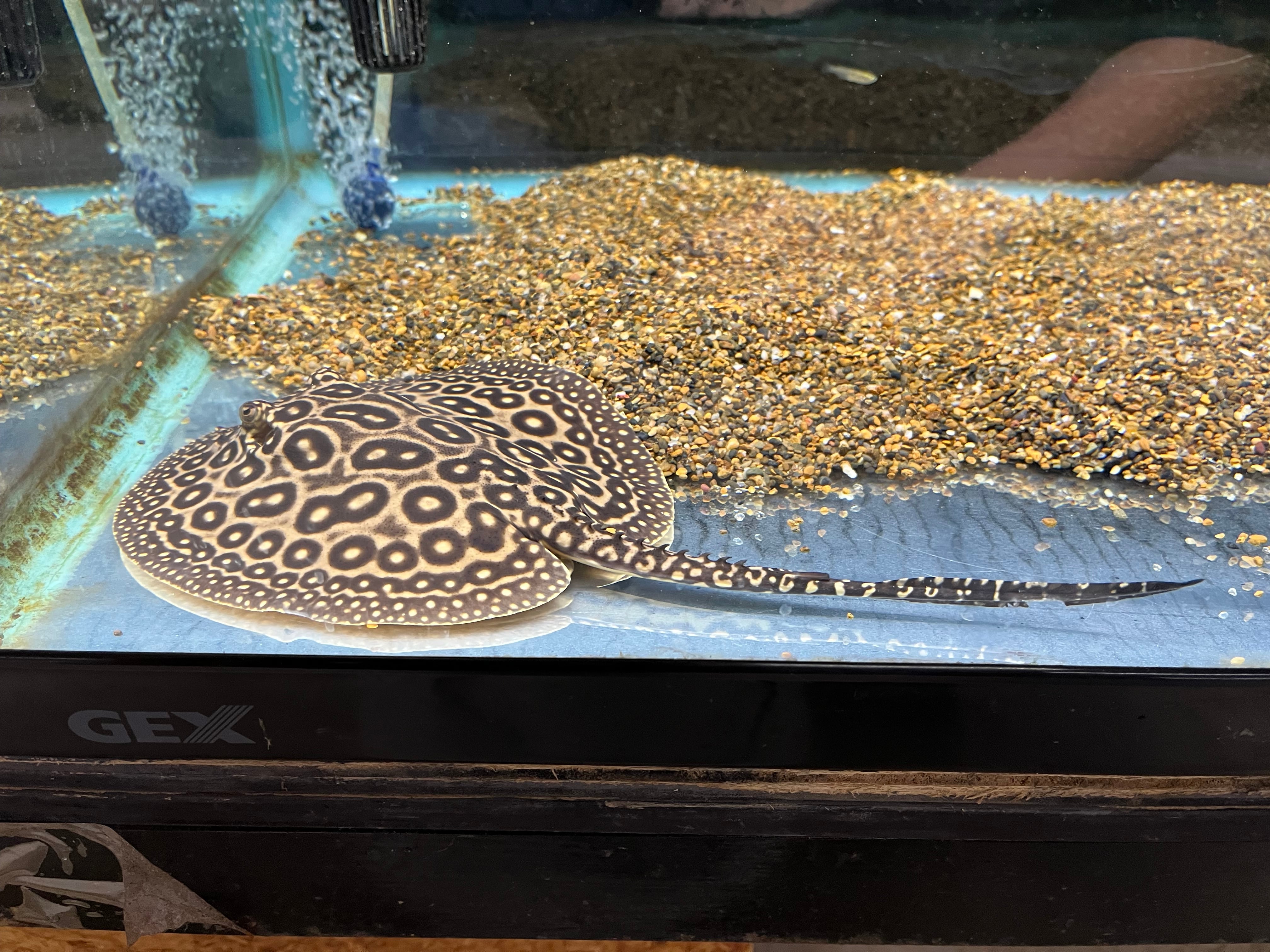 マレーシアより入荷したブリードのクロコダイルスティングレーです。現在のサイズはオス体盤約15cm、メス体盤約17cm。
