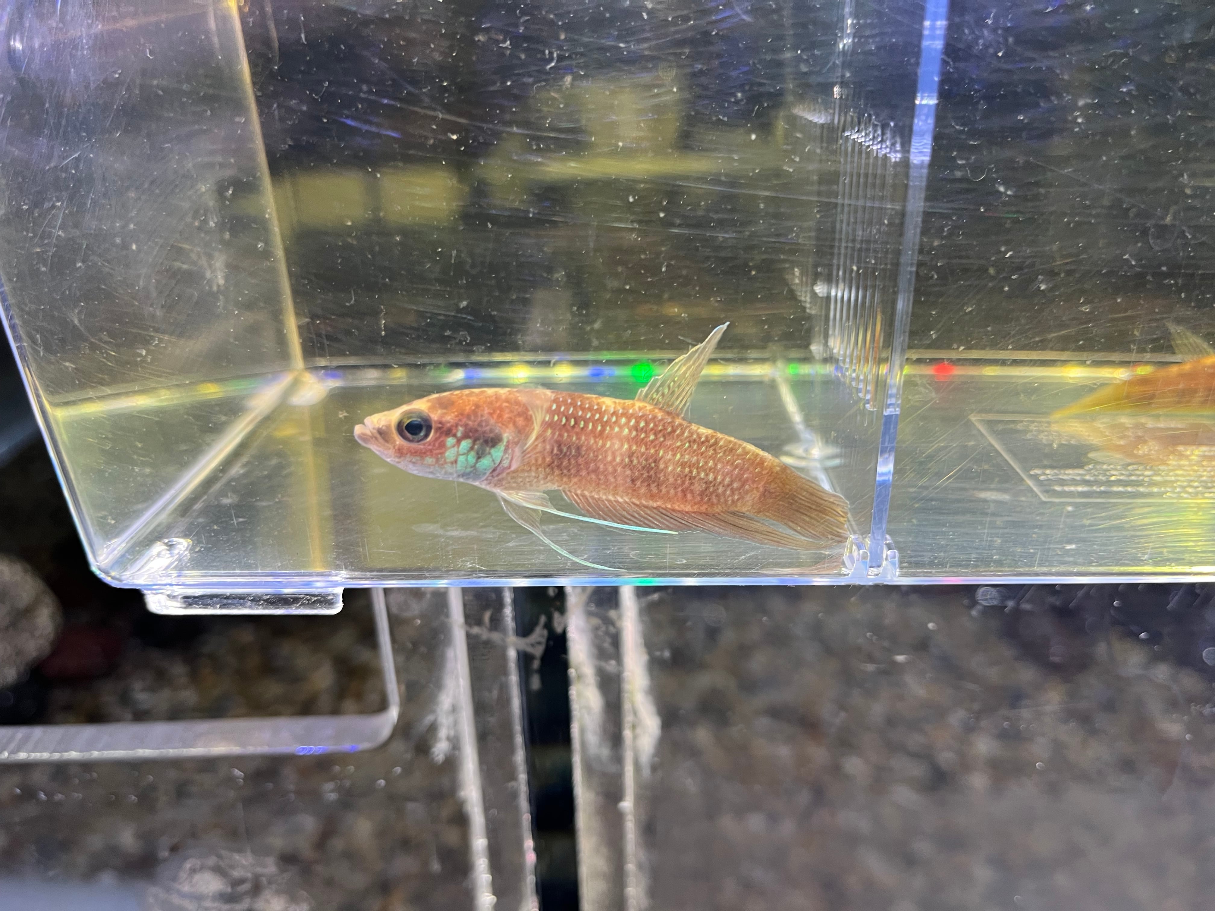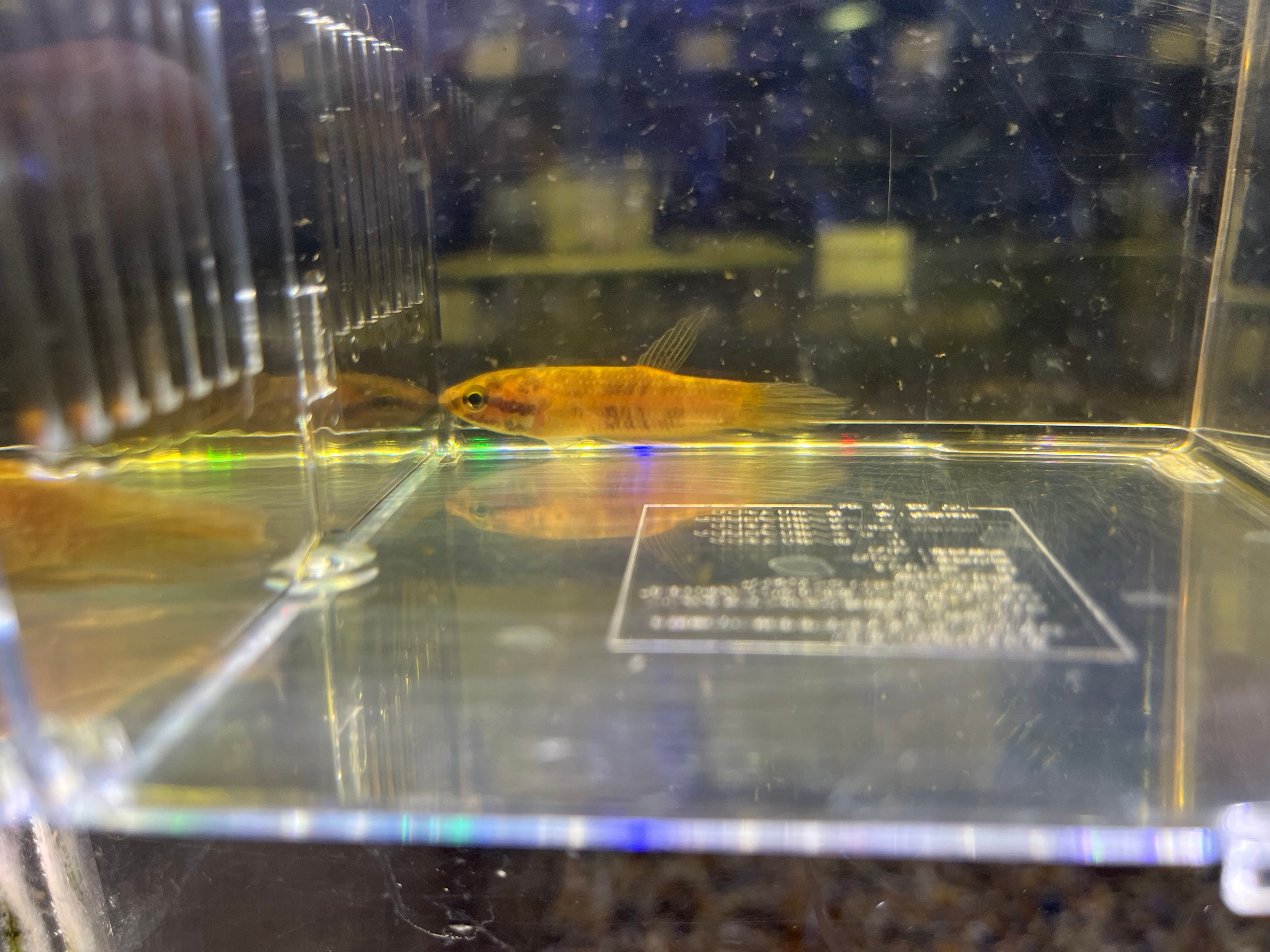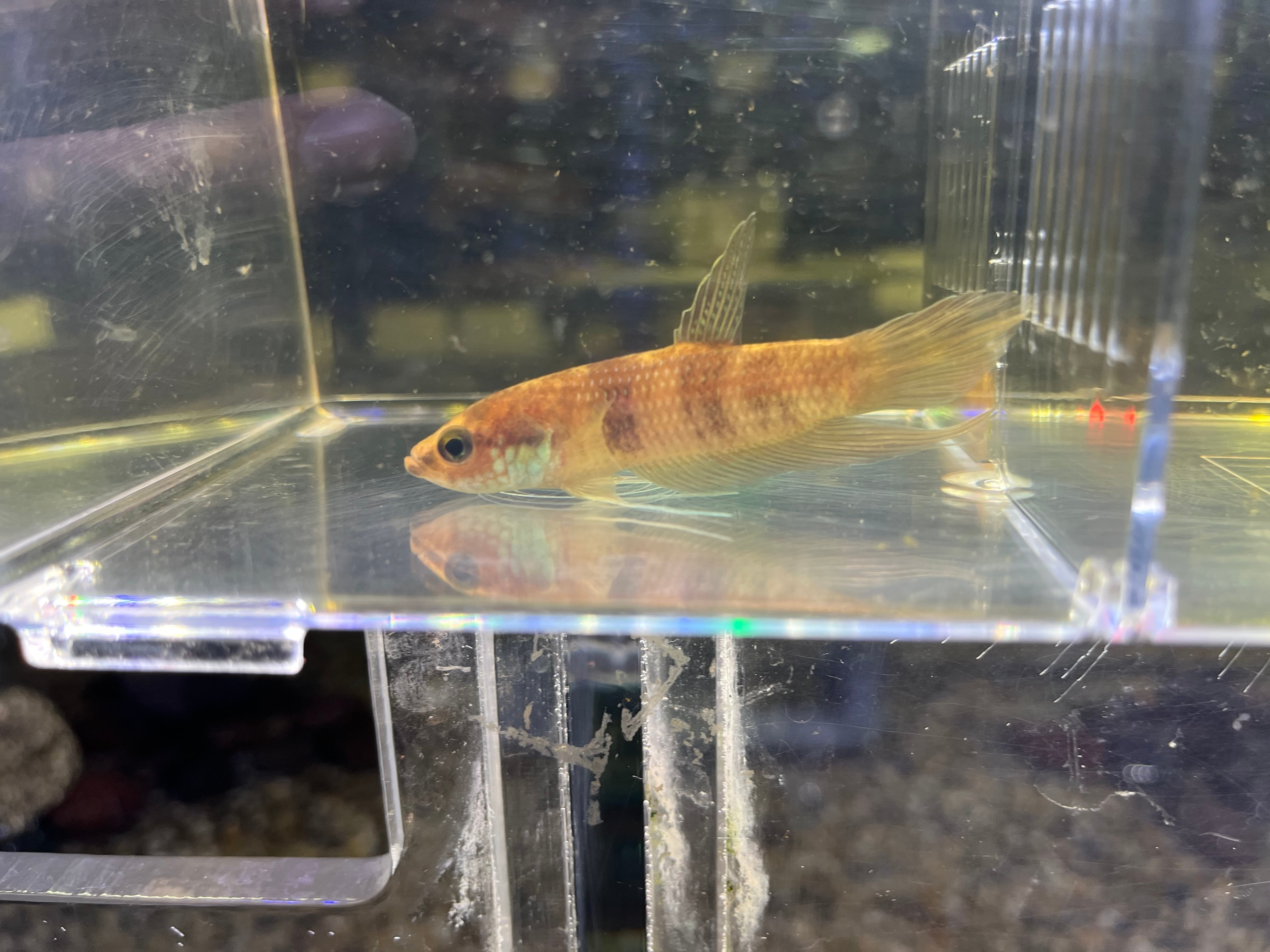 プグナックスグループの中型種でオスは頬や各ヒレがエメラルドグリーンに染まる美種です。輸入時のインボイスネームはベタフスカ。古くから知られる種類ですが、フスカはじめプグナックスグループには似たような種類が何種類か存在するため正確な種類の判断が難しいグループです。繁殖形態はオスが卵を口に咥えてふ化させるマウスブルーダーです。今回はスマトラ産です。写真1〜4枚目がオス個体、5〜8枚目はメス個体になります。ペア販売のみ。