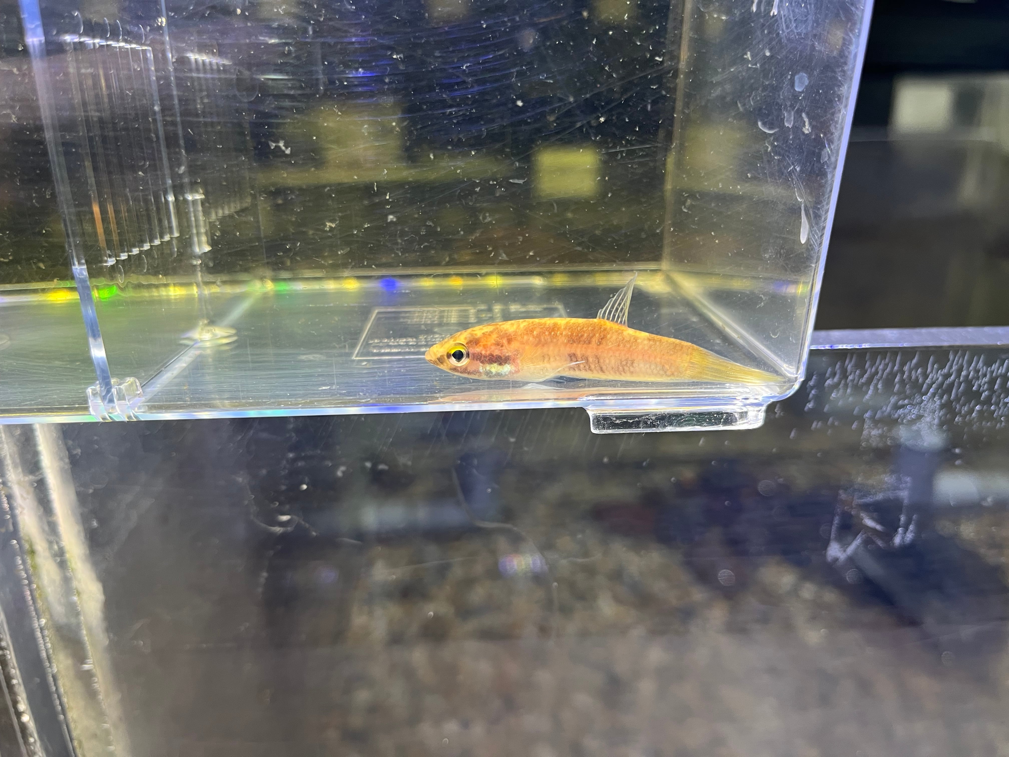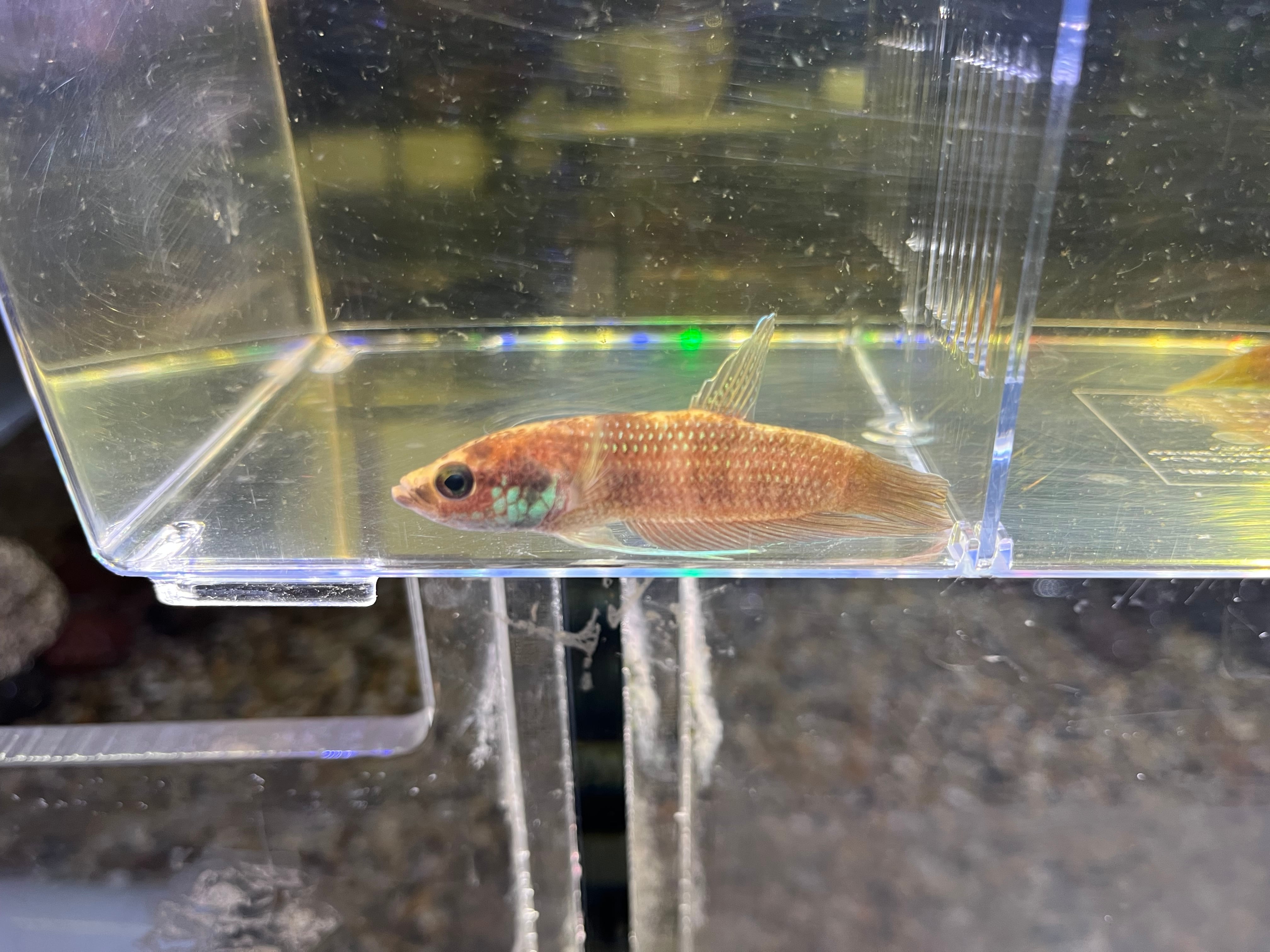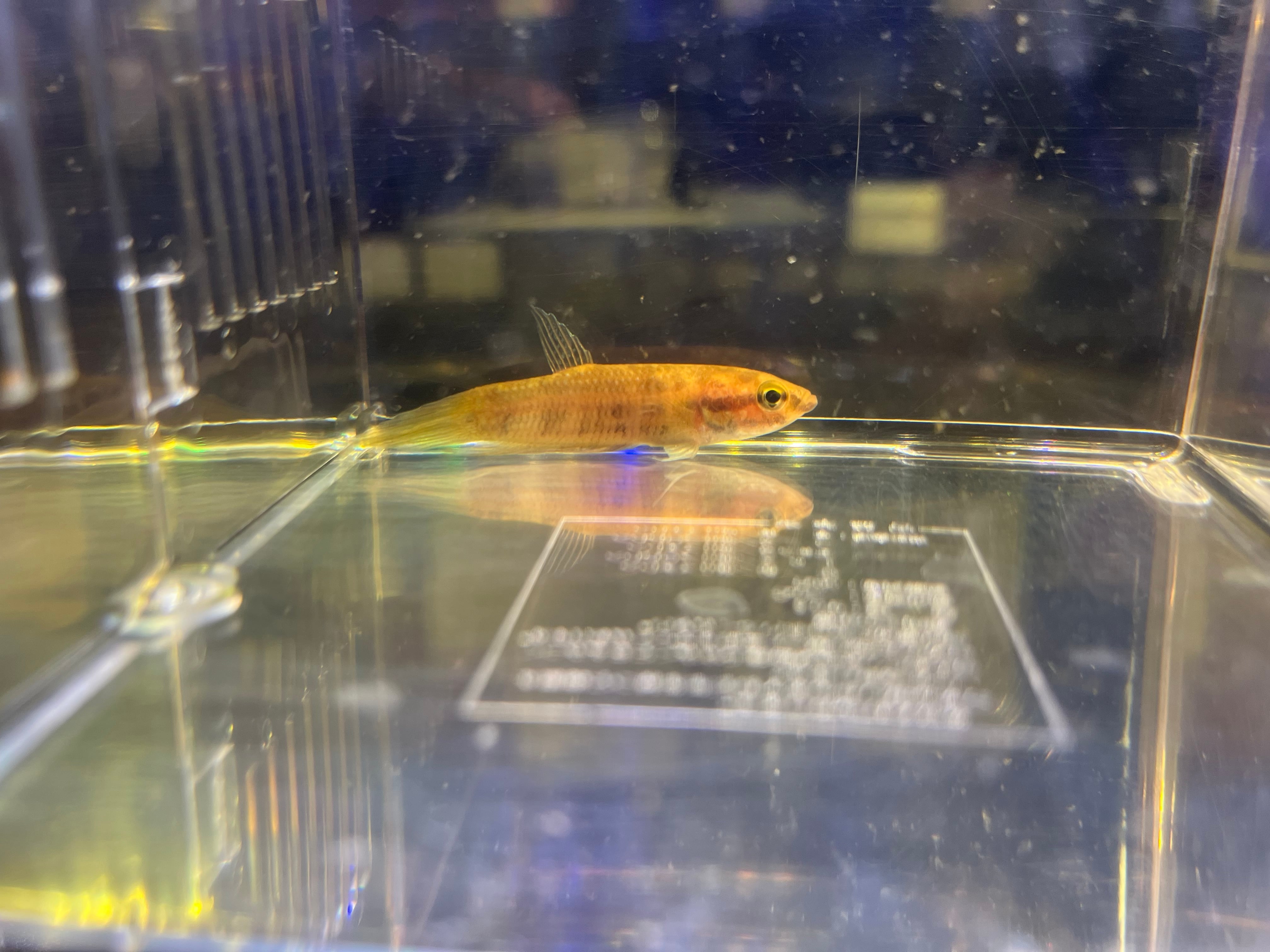プグナックスグループの中型種でオスは頬や各ヒレがエメラルドグリーンに染まる美種です。輸入時のインボイスネームはベタフスカ。古くから知られる種類ですが、フスカはじめプグナックスグループには似たような種類が何種類か存在するため正確な種類の判断が難しいグループです。繁殖形態はオスが卵を口に咥えてふ化させるマウスブルーダーです。今回はスマトラ産です。写真1〜4枚目がオス個体、5〜8枚目はメス個体になります。ペア販売のみ。