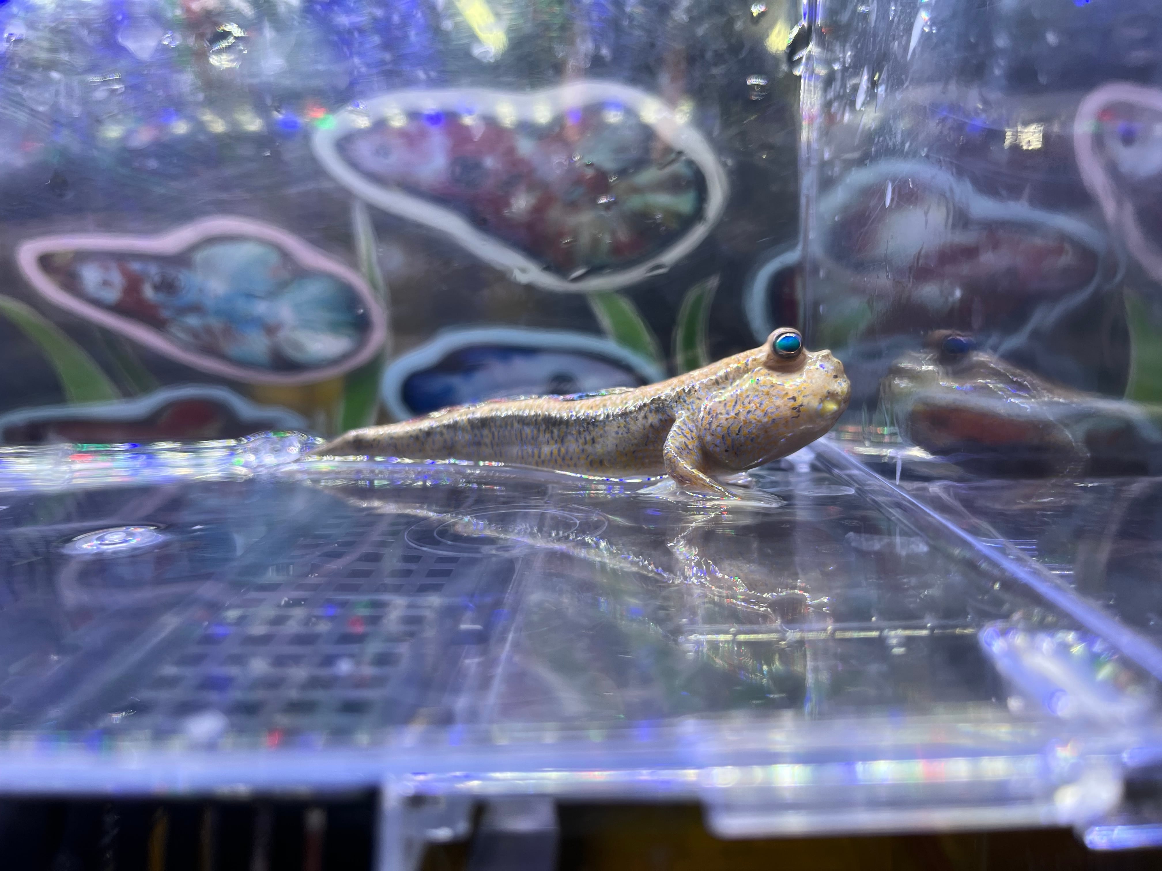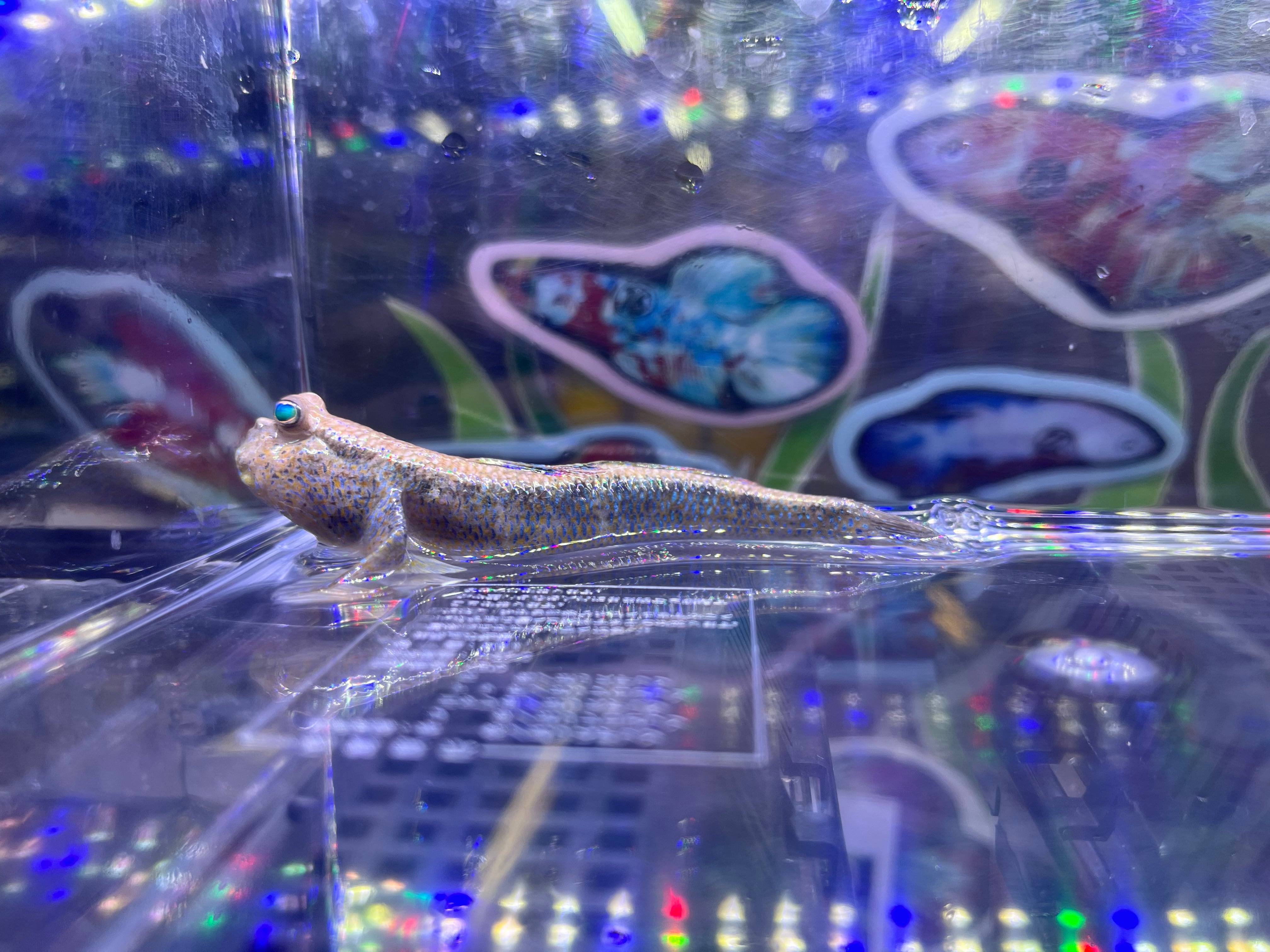 インドネシアに生息する大型トビハゼの一種です。婚姻色を発したオスは鮮やかなブルーの体色に彩られ非常に美しくなります。珍しい種類でほとんど輸入されないため飼育データの乏しい種ですが、基本的な飼育方法や環境はマッドスキッパーに準じます。汽水域に生息するため飼育には塩分が必要です。テリトリー意識が非常に強く、特にオス同士は激しいケンカをするため単独飼育推奨です。