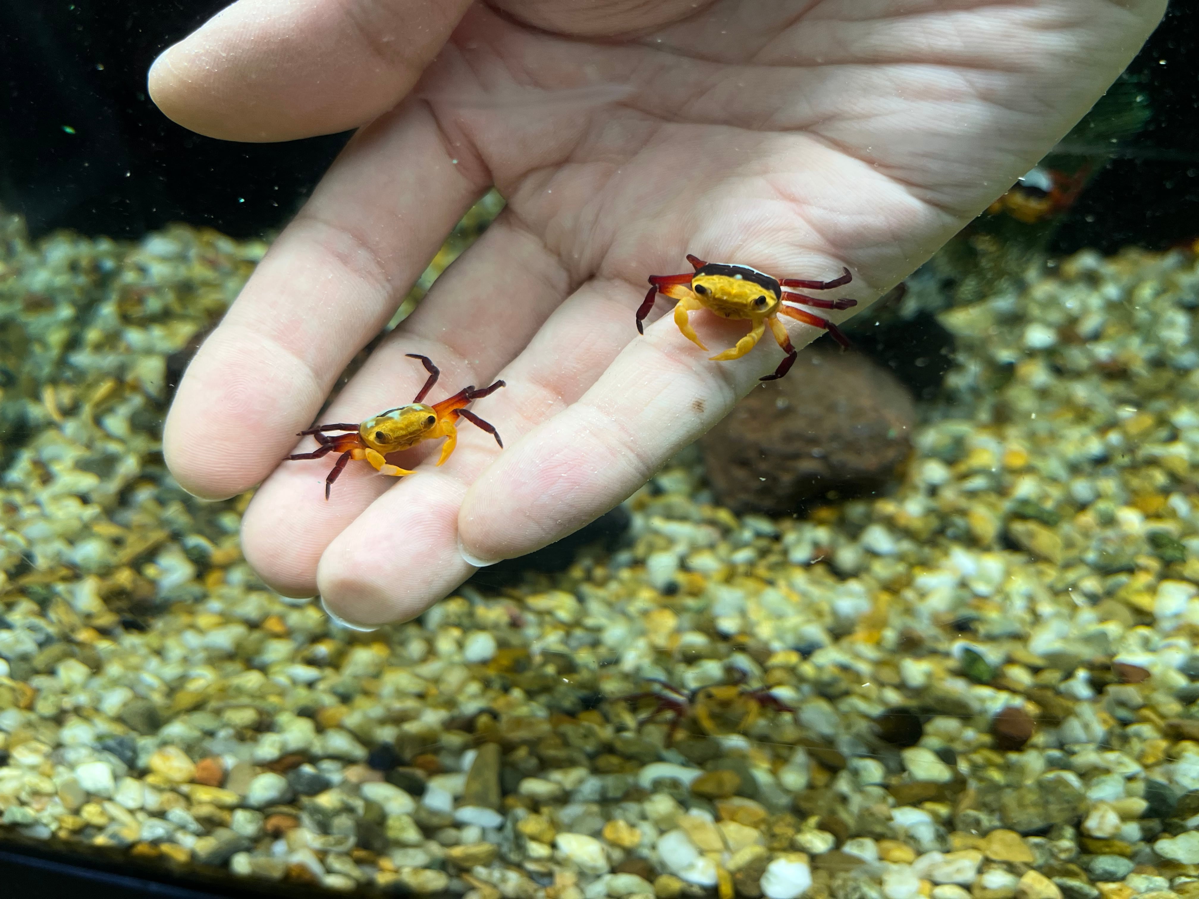 比較的最近になって輸入されるようになったインドネシア産の完全水棲淡水ガニです。カラフルな体色とコミカルな動きから非常に人気が高い種類です。性格は比較的大人しく、同種同士の複数飼育も比較的容易です。ただし空腹時は共食いをしてしまう事があるのでエサ切れには注意してください。完全水棲種で乾燥には極端に弱いので注意が必要です。オス個体1匹の販売です。