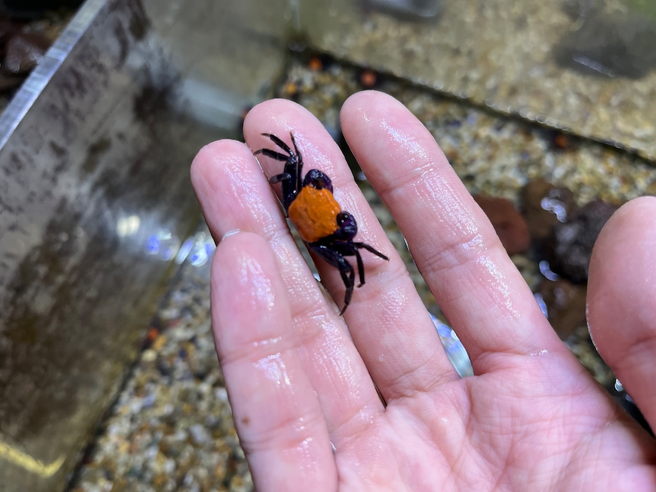 インドネシア産の淡水ガニです。20種類以上存在し、カラフルな体色とコミカルな動きから非常に人気が高い種類です。同種同士の複数飼育も比較的容易で、飼育下での繁殖も楽しめます。基本的に陸上での活動が多いですが、水がないと呼吸できなくなるため、必ず水場は設置してください。また、空腹時は共食いをしてしまう事があるのでエサ切れにも注意してください。オス個体1匹の販売です。