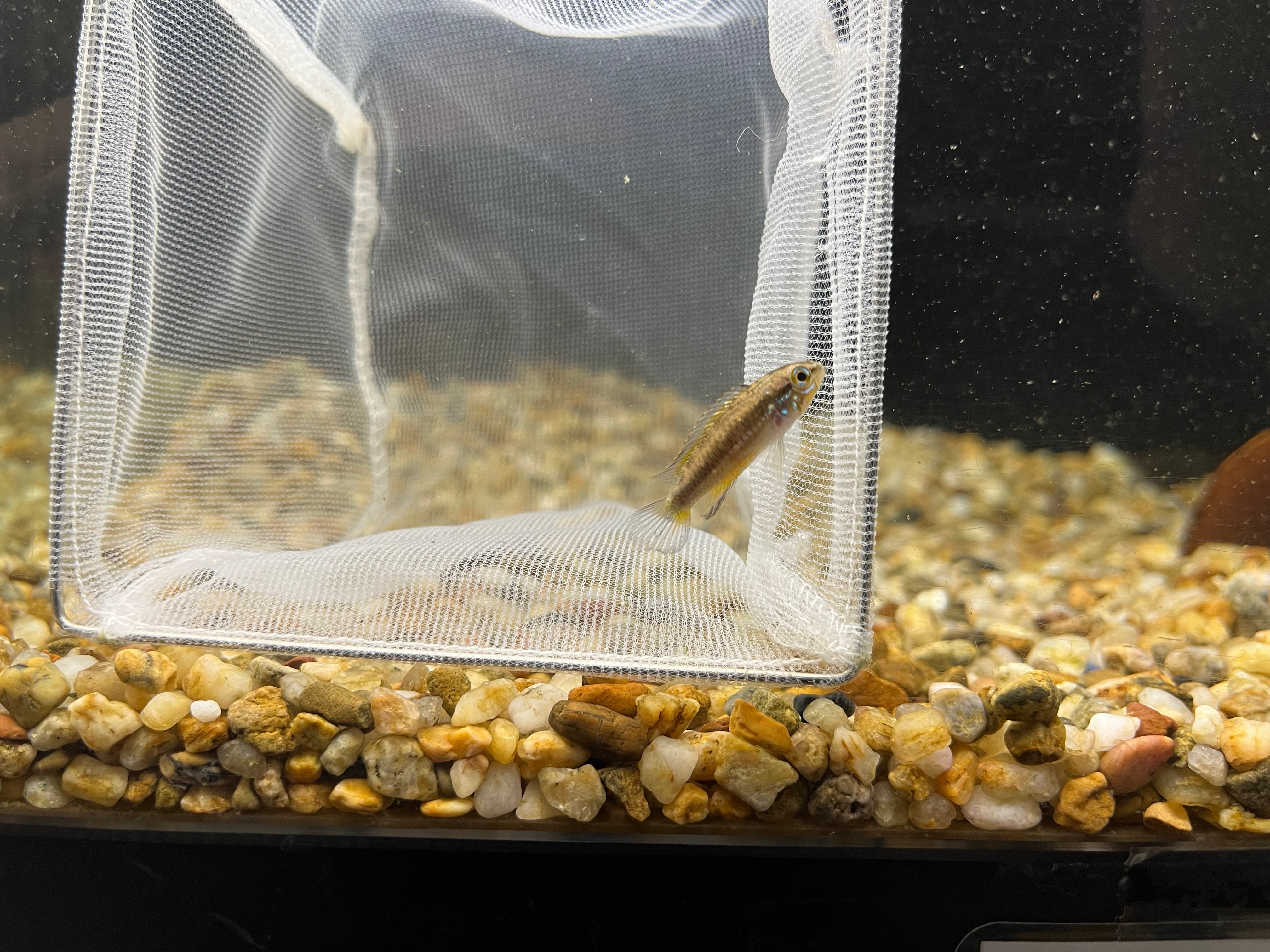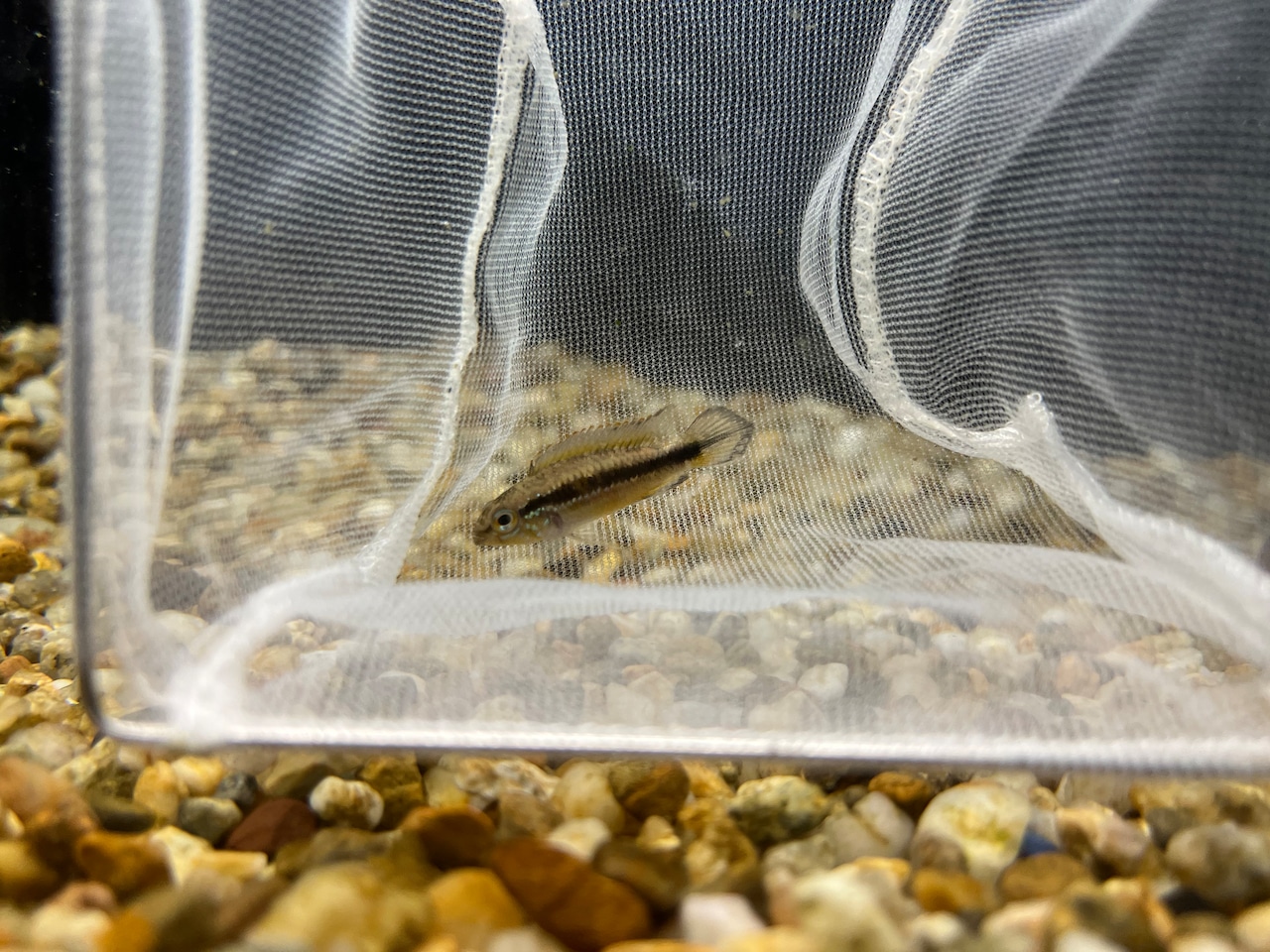 ペルー便で入荷したナナイ川産の野生のアピストグラマアカシジィです。現在のサイズはオス約3cm、メス約2cm。