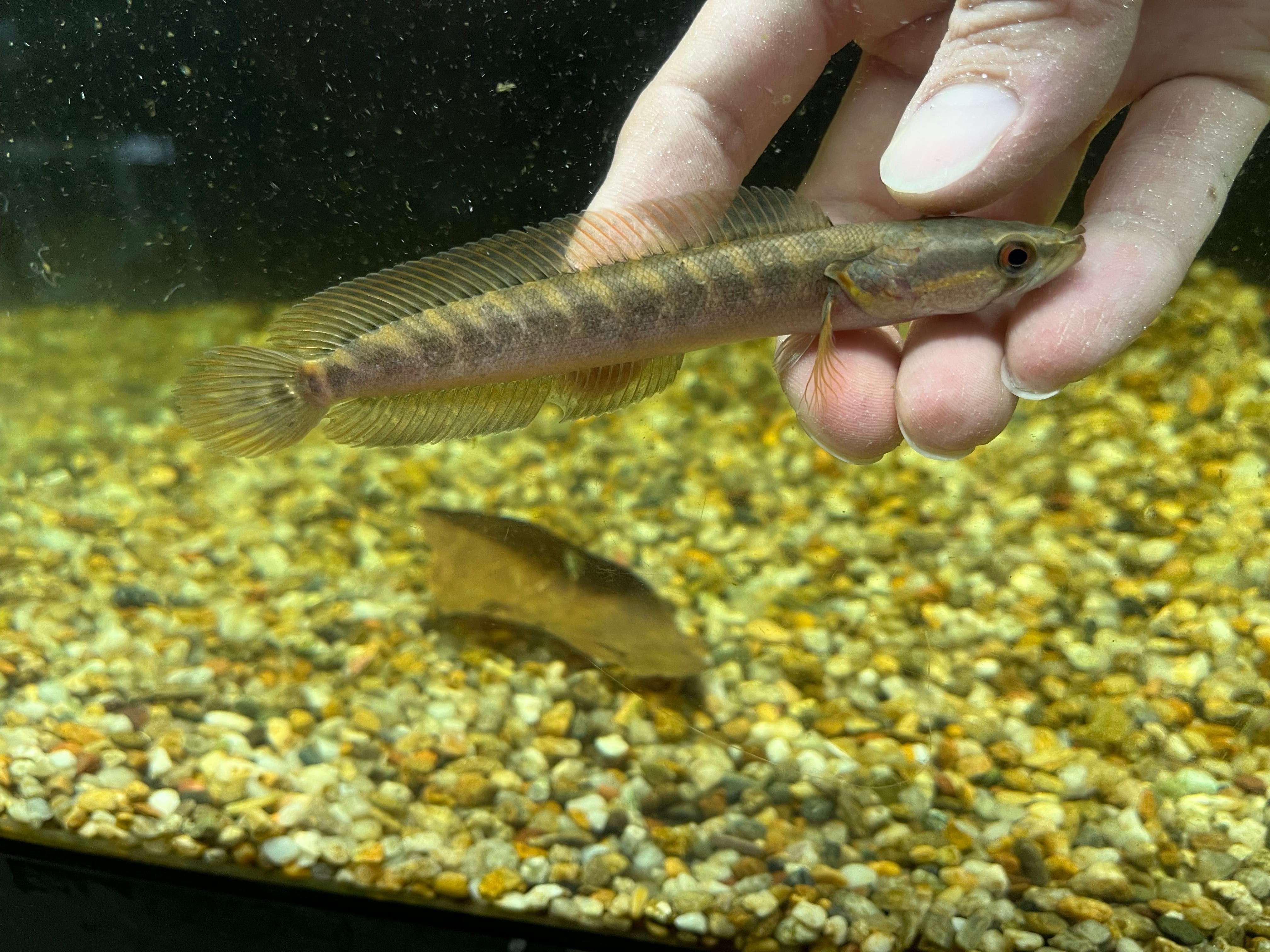 ナイジェリアから輸入されるスネークヘッドの一種です。名前は知られるものの、アフリカに生息する3種類のパラチャンナの中でも入荷量は少なく年に数回見かける程度です。オレンジ〜茶色ベースの体色に複数入るバンドとのコントラストが美しい人気種です。よくジャンプをするため水槽のフタはマストです。