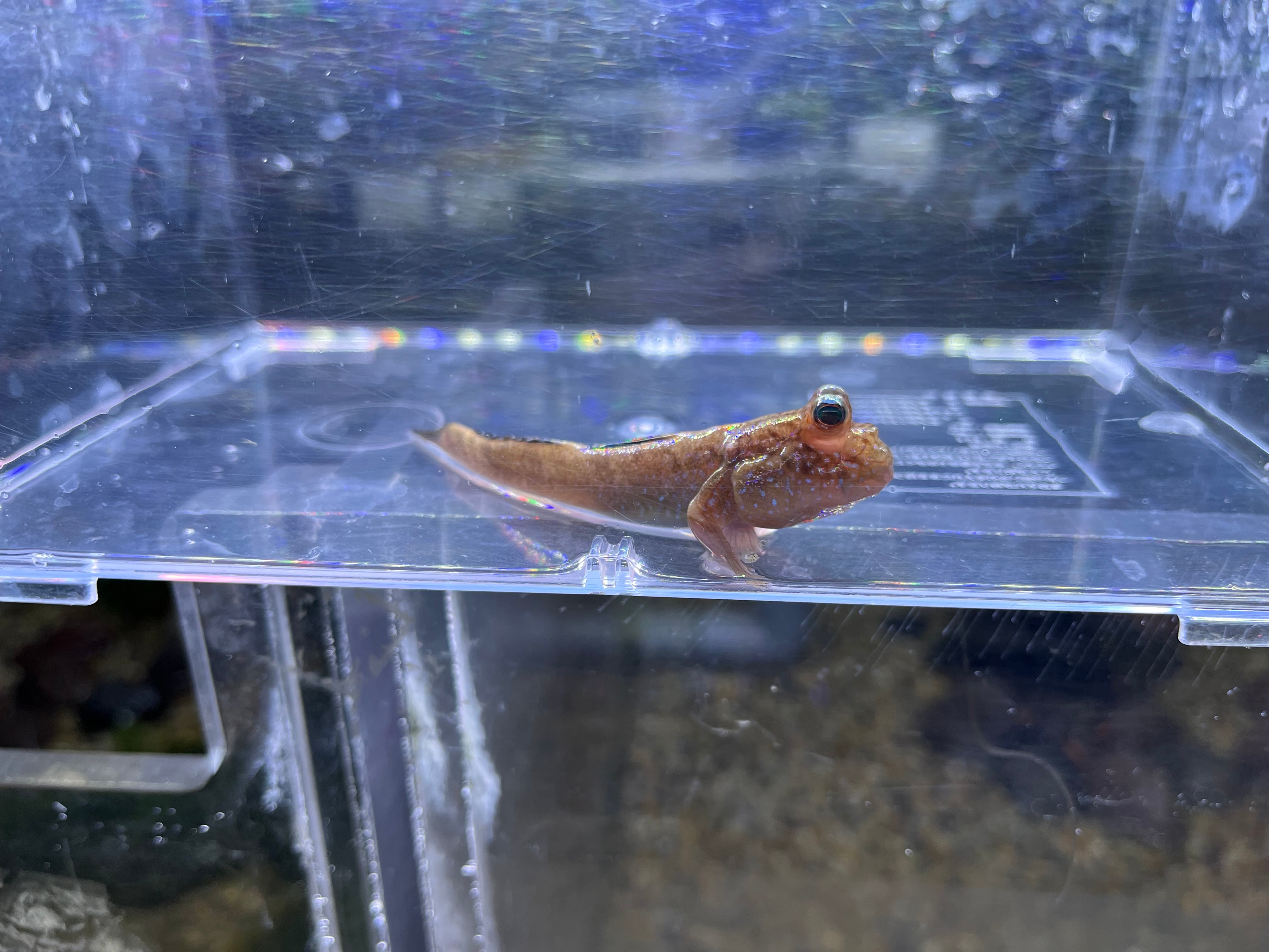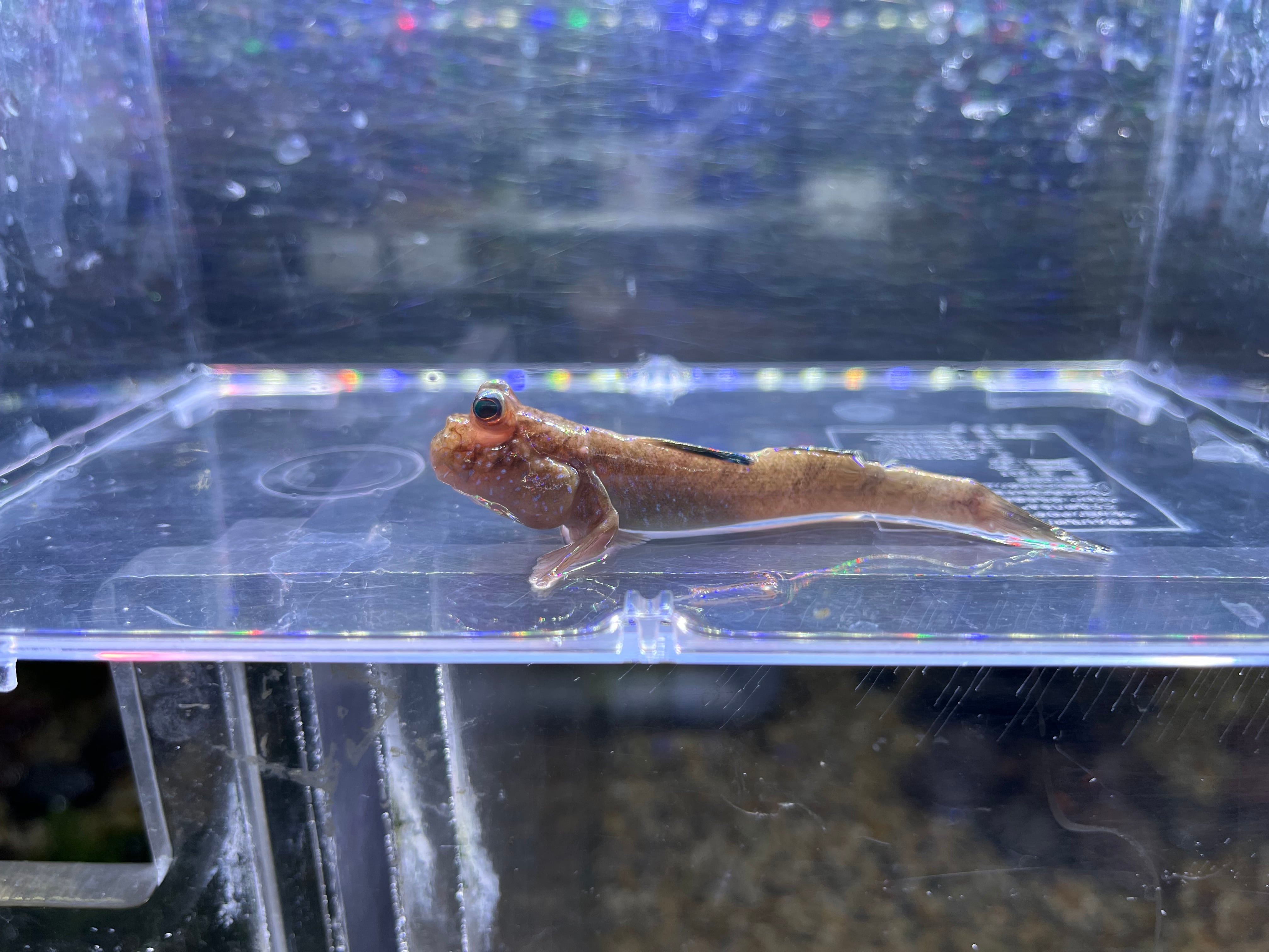 ナイジェリアに生息する大型トビハゼの一種です。婚姻色を発したオスは背ビレが鮮やかなブルーに彩られ美しくなります。基本的な飼育方法や環境は他のマッドスキッパーに準じます。汽水域に生息するため飼育には若干の塩分が必要です。テリトリー意識が非常に強く、特にオス同士は激しいケンカをするため単独飼育推奨です。現地では30cm近い個体も捕獲されており食用魚としても利用されます。