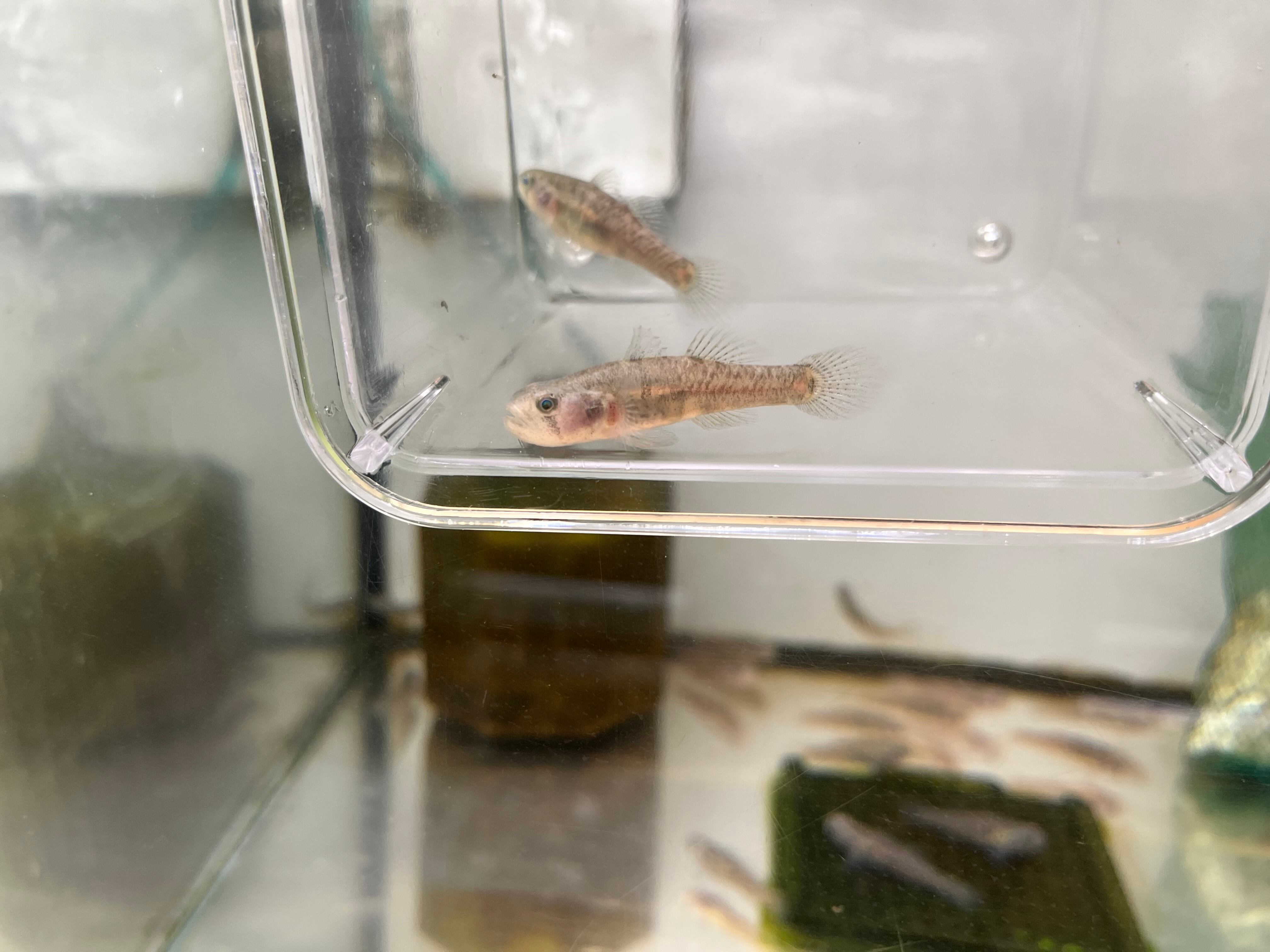 比較的最近になって流通しはじめたナイトゴビーに近縁なハゼの一種です。外見はナイトゴビーによく似ますが、オスの背ビレがより短い点等で容易に判別できます。従来のナイトゴビーに比べ塩分を必要としないため、飼育は純淡水で全く問題ありません。オス1匹とメス1匹のペア販売です。
