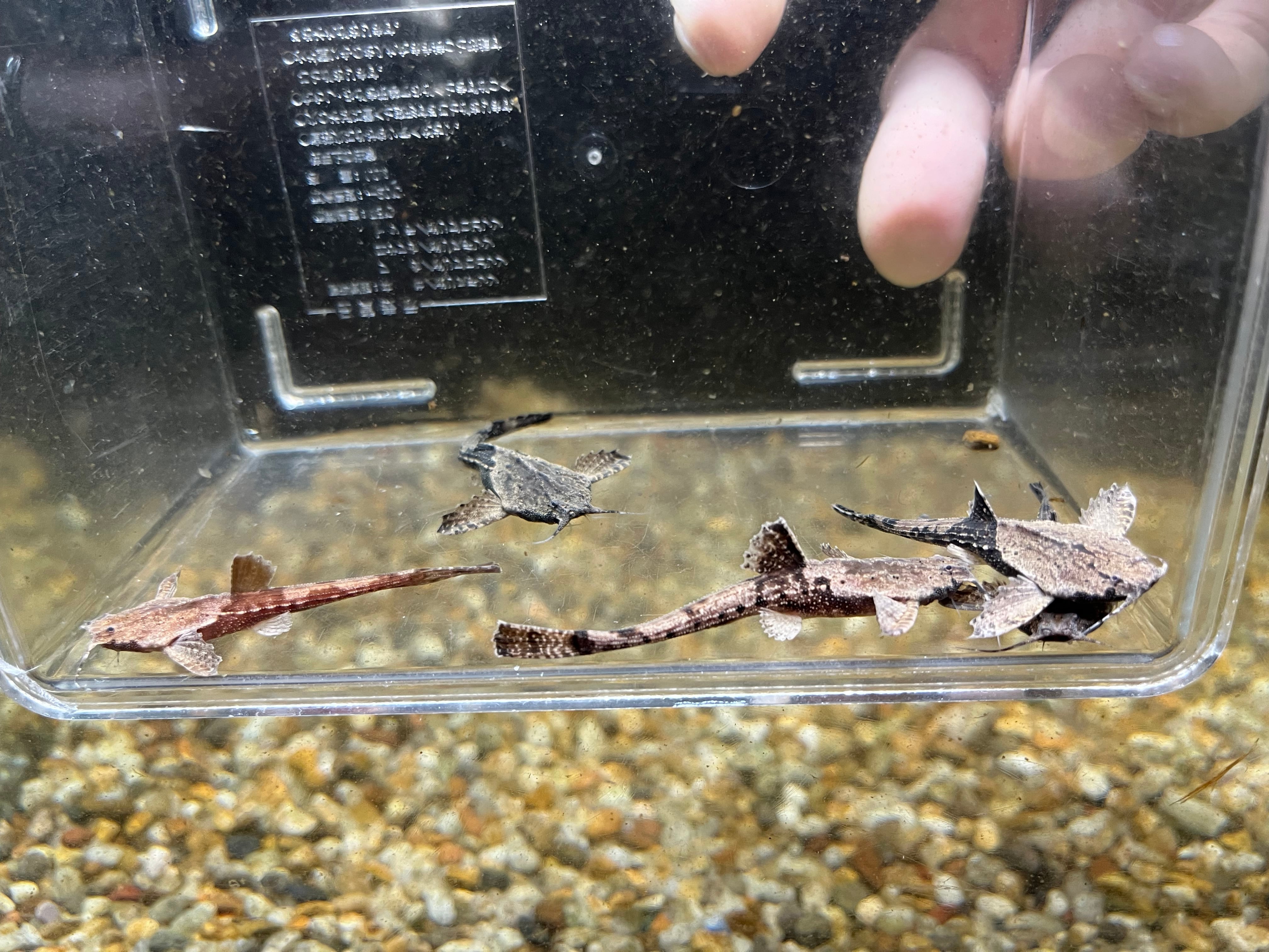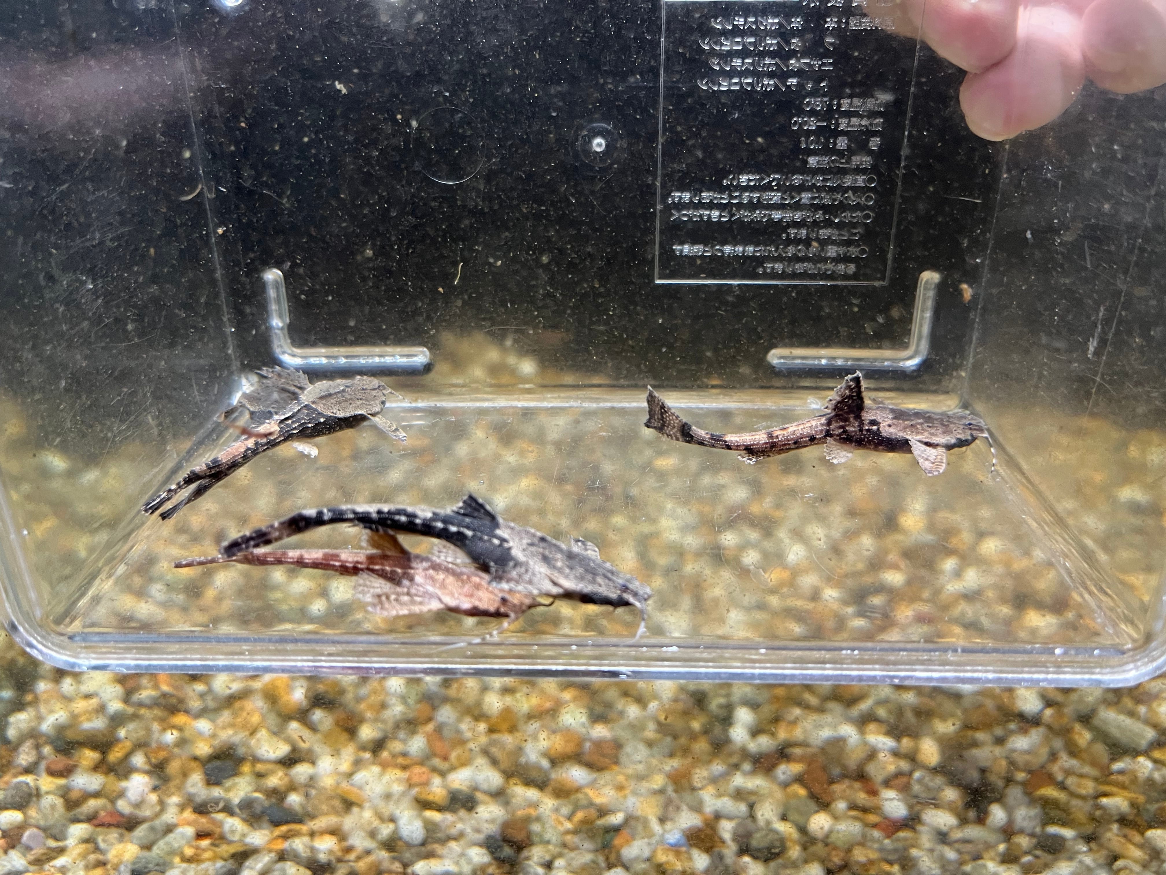 古くから輸入されるポピュラー種で、南米に広く分布します。体型が楽器のバンジョーに似ている事からこの名前が付いたユニークなナマズです。日中はほとんど底砂の中に潜っており、夜間エサを入れると砂の中から出てきてエサを探して徘徊します。