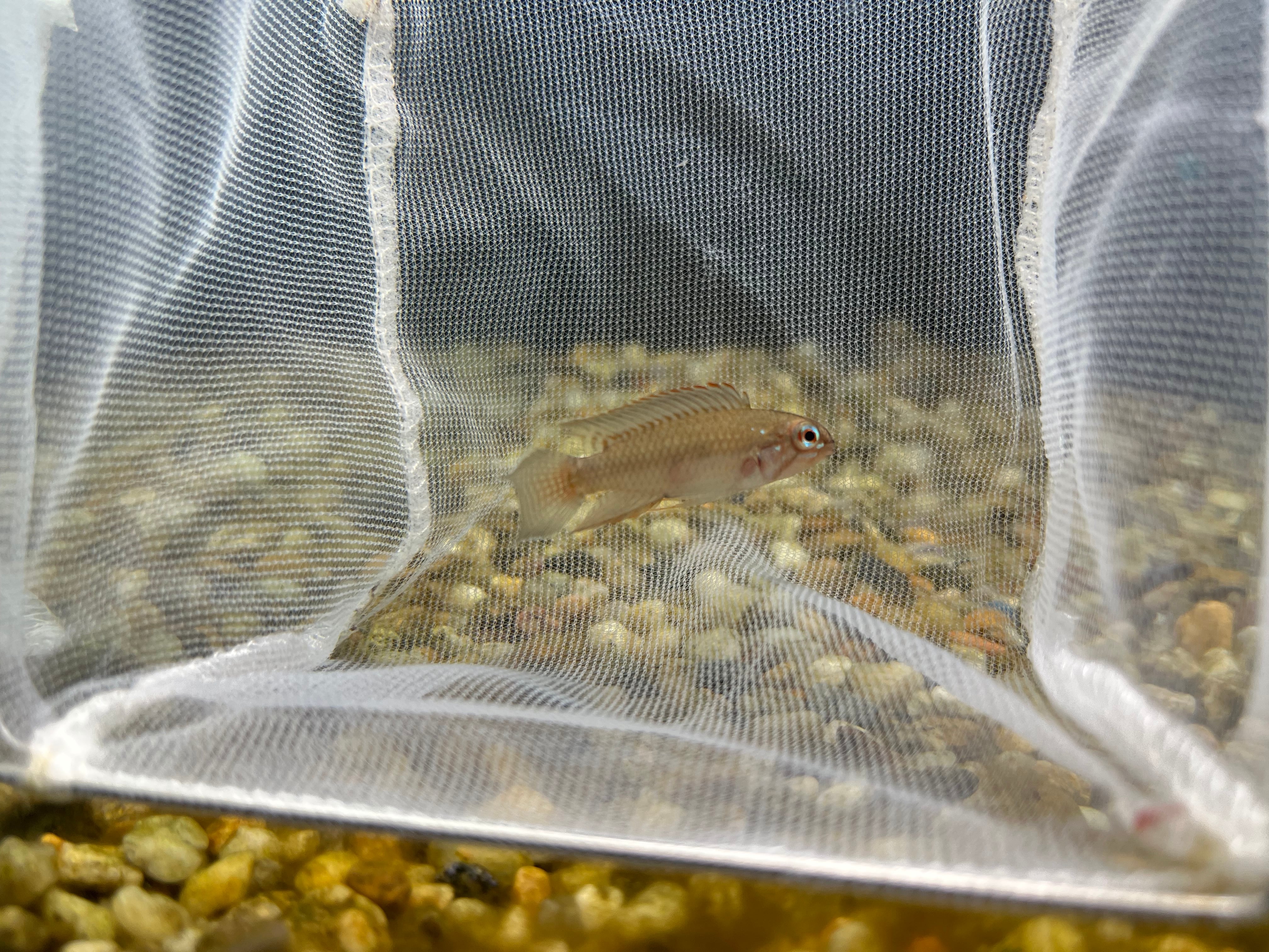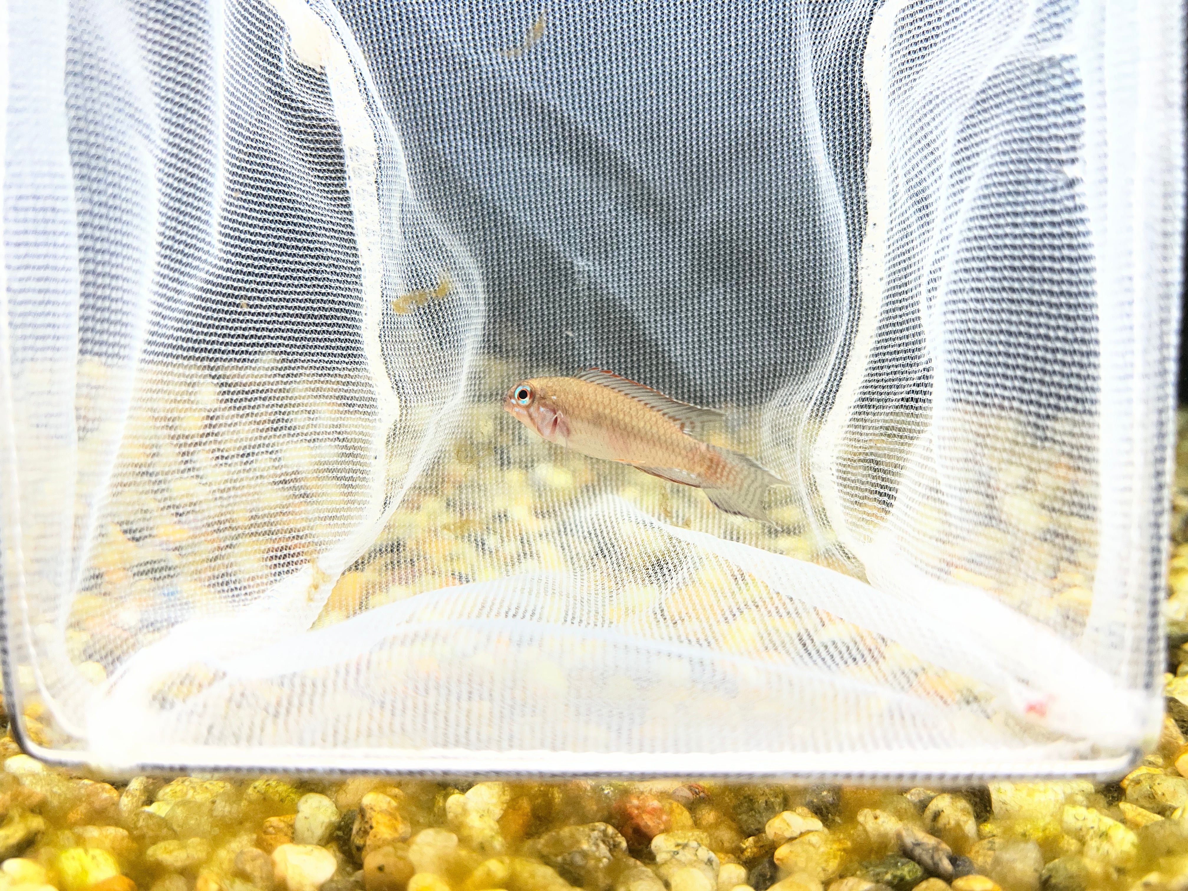 国内便で入荷したアピストグラマウアウペス(spロートカイル)デミニ川産のCBです。現在のサイズはオス約3cm、メス約2cm。