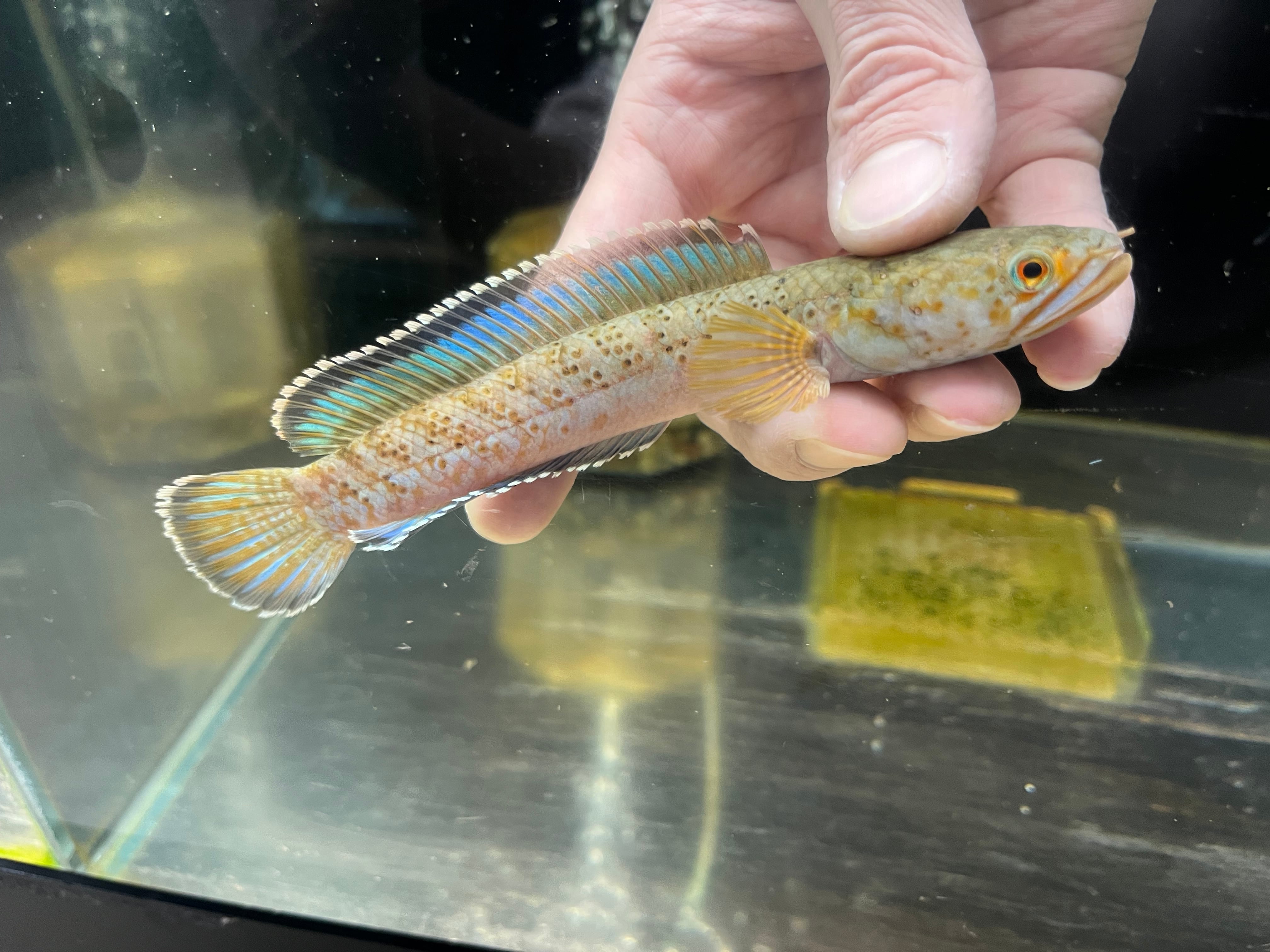 アリストネイ、ビプリと並び人気の高い青系スネークヘッドの代表種です。かつてはブルームーンギャラクシーという流通名でビプリと混同されていた時期もありましたが現在は分類されています。地域バリエーションがいくつかあり、メガラヤレオパードやインセインとうタイプも時折流通します。本種最大の魅力である鮮やかな青色を発色させるには、硬度を含んだ中性の飼育水で水温を20-22度に保ち、強めの照明を当てることで美しく発色します。よくジャンプをするので水槽のフタは必須です。
