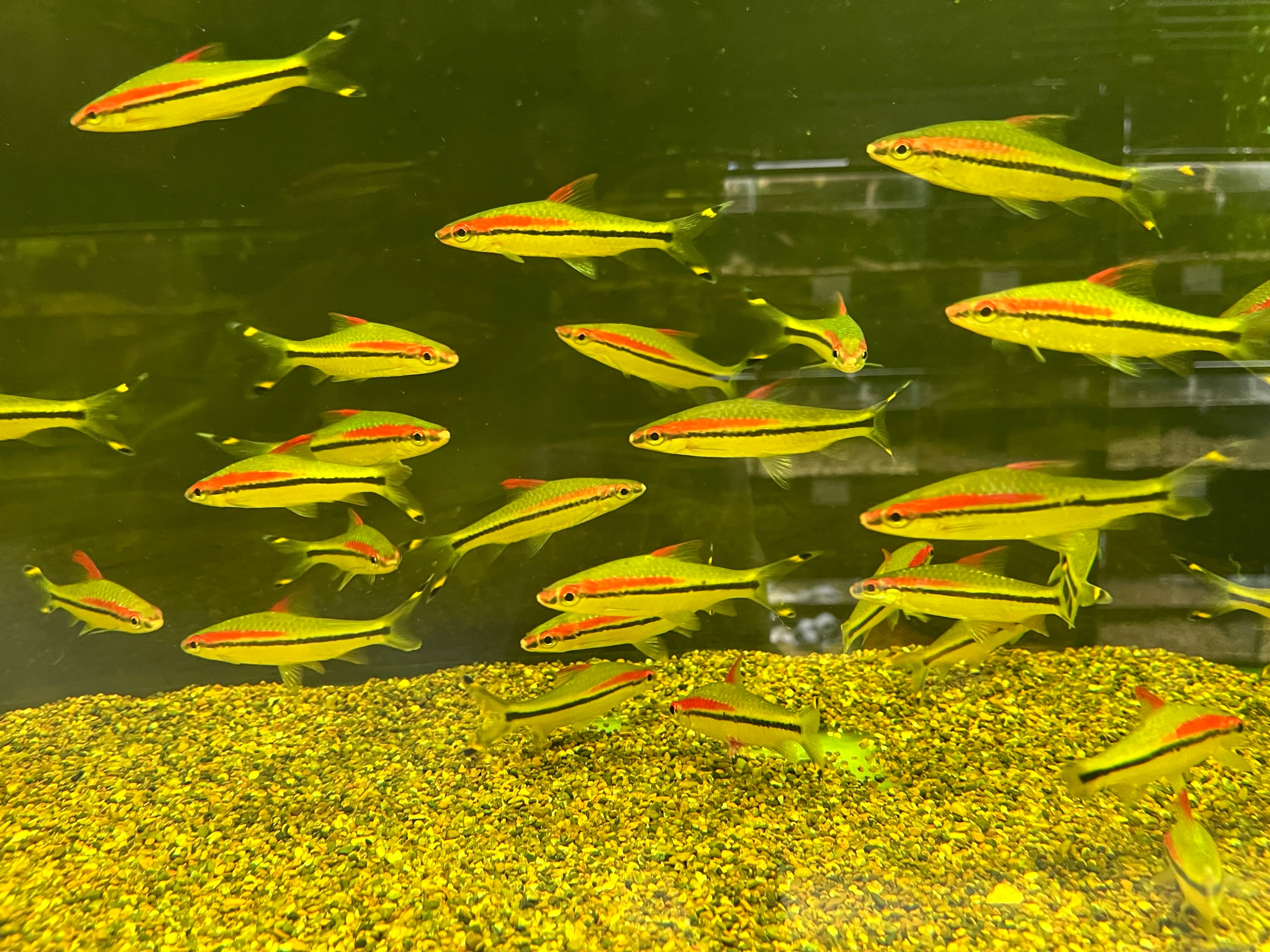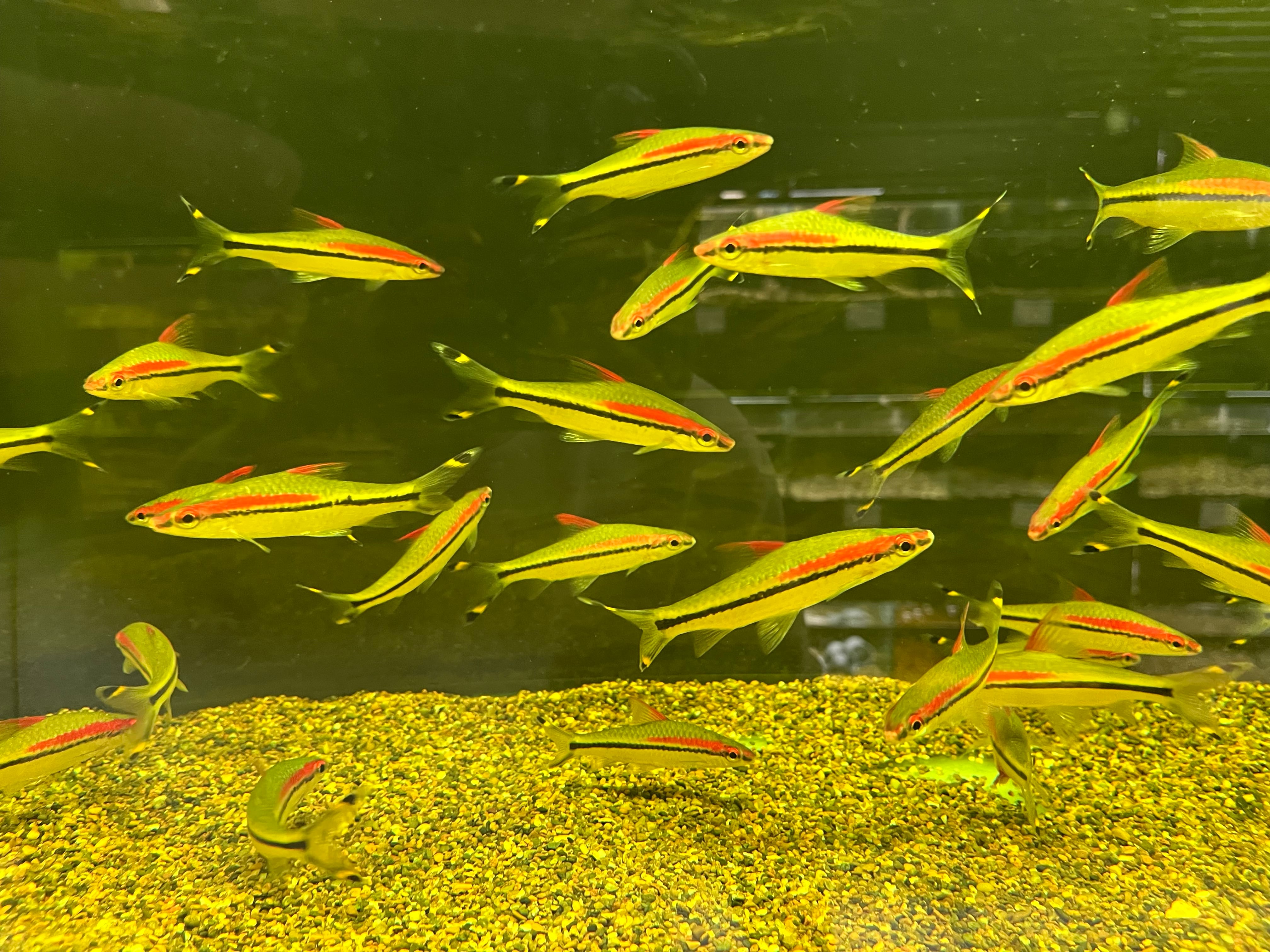 インドから輸入される中型バルブのポピュラー種。主に東南アジアブリードが流通しますが、今回はインドより輸入した野生採集個体です。飼育環境に馴染むと目からエラ蓋後方にかけて入るレッドラインが濃くはっきりして非常に美しくなります。水槽内でもよく泳ぎ回るため見ていて飽きのこない魚です。水草も食害しないので、水草水槽で5〜10匹程度の群れで飼育するととても見応えがあります。素早いためサイズの指定は不可。
