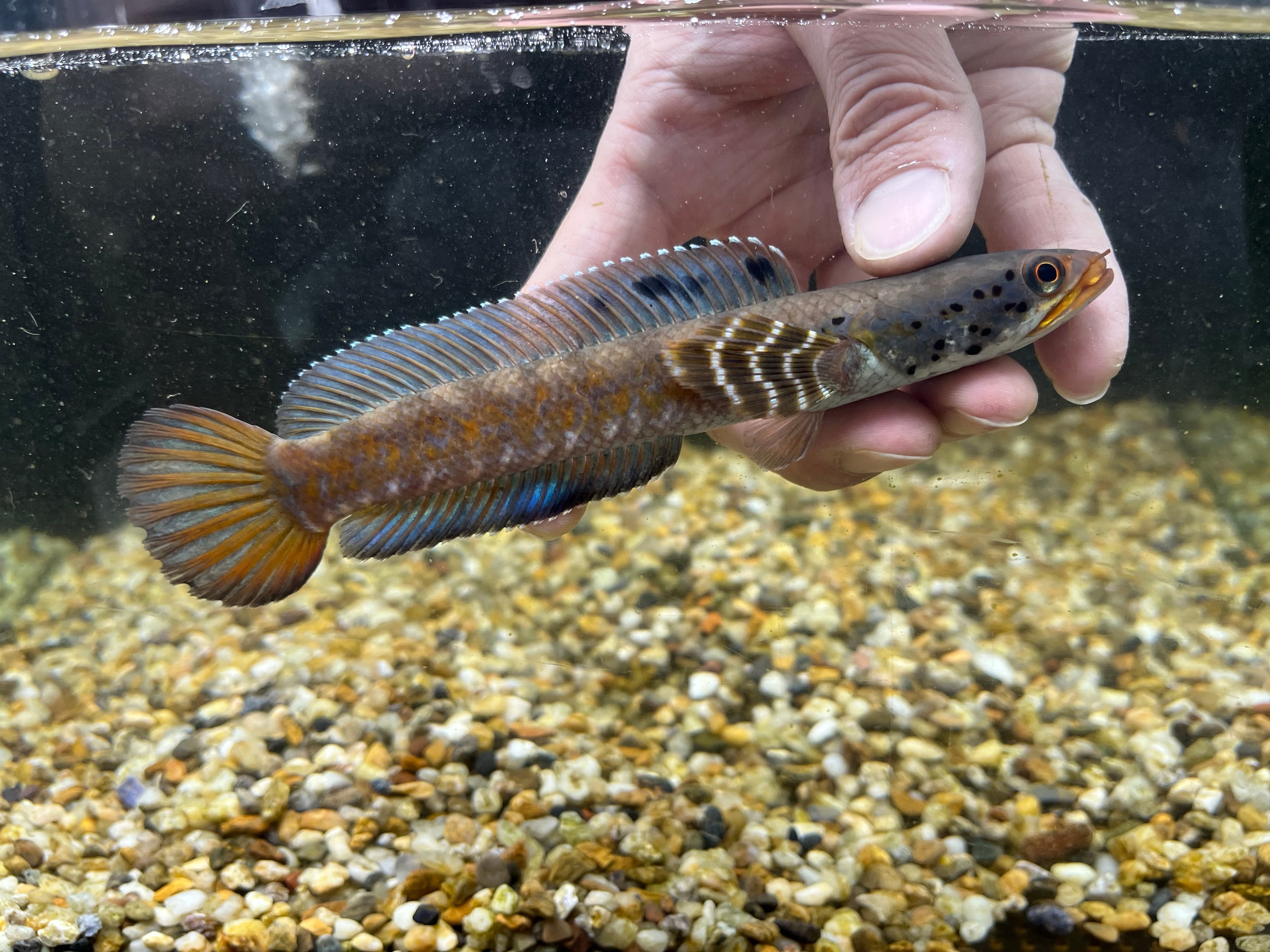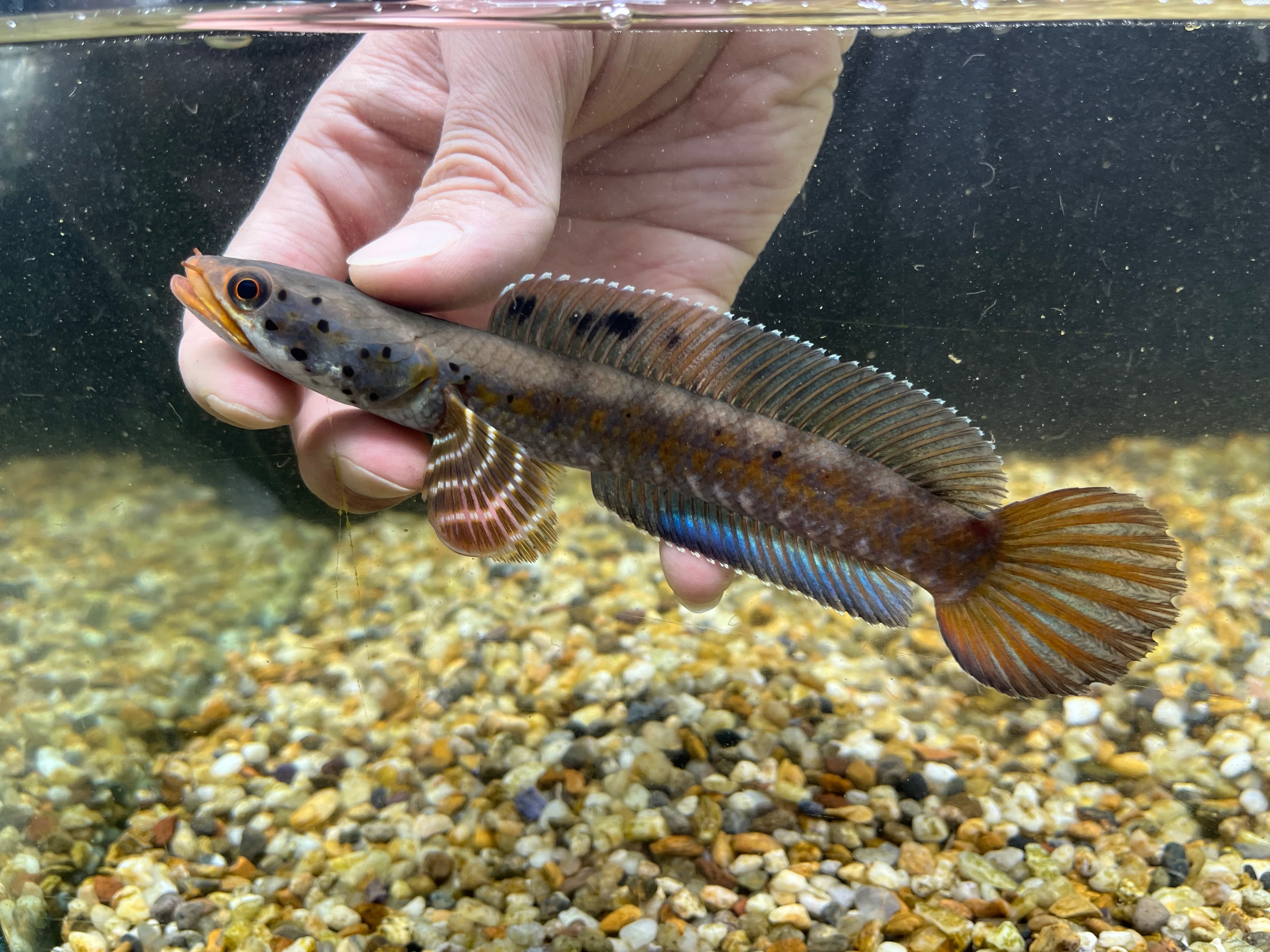 ミャンマーに生息するスネークヘッドで、オルナティピンニスの小種名がつく前はspスーパーブルームーンという流通名で販売されていた種類です。適した飼育環境下では体色が深みのある青色に染まり大変美しくなります。今回はミャンマー採集個体です。よくジャンプするので水槽のフタは必須です。