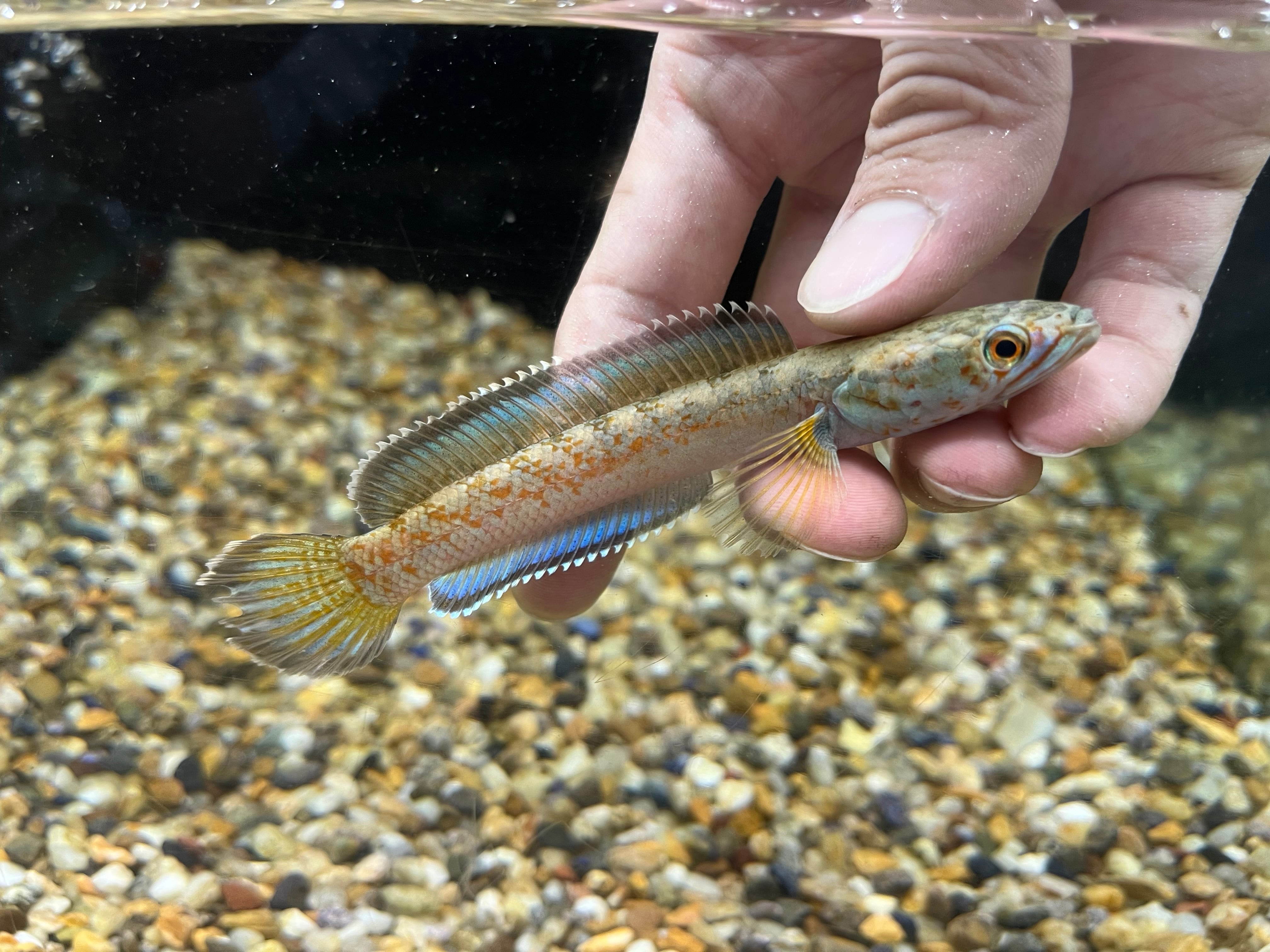 2020年に新種として記載されたアリストネイに次いで発見された青系スネークヘッドのsp種です。全体的な印象はアリストネイに非常によく似ますが、コンディションの良い本種はボディが金色に輝き、その姿が砂金をまぶしたように見える事からゴールドダスト(砂金)の名称がつけられました。