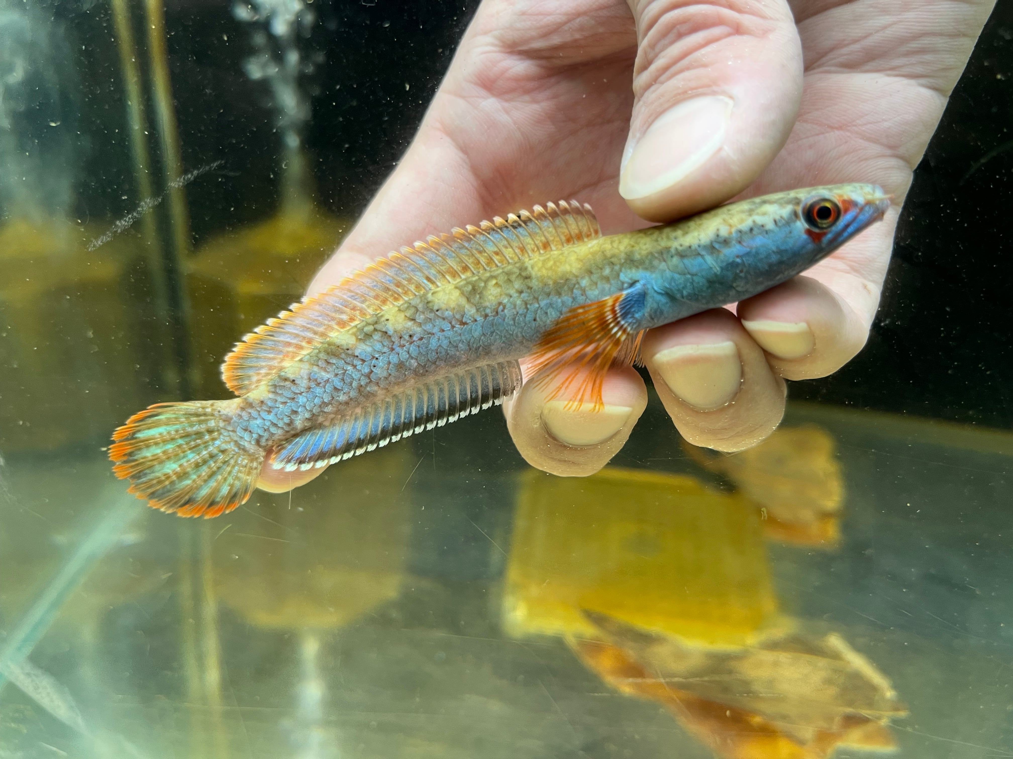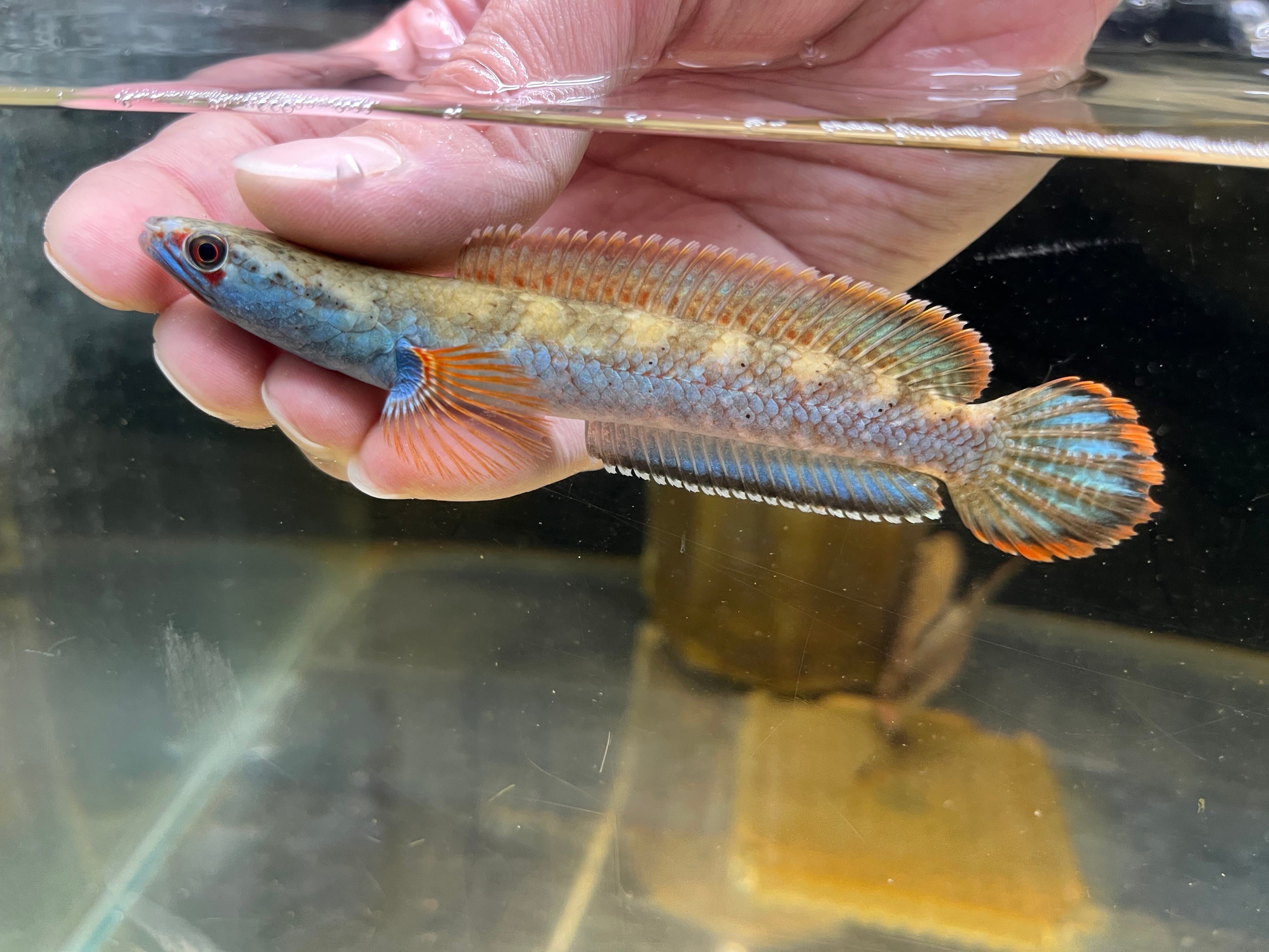 ミャンマーに生息するスネークヘッドです。ボディに入るメタリックブルーやヒレのオレンジエッジが美しく絶大な人気を誇るスネークヘッドです。また目の周りに入る赤い模様がカブキ役者の隈取に見えることからカブキの流通名もあります。発見から長らくsp種として扱われてきましが、近年の研究でチャンナフィロフタルムスと学名がつきました。