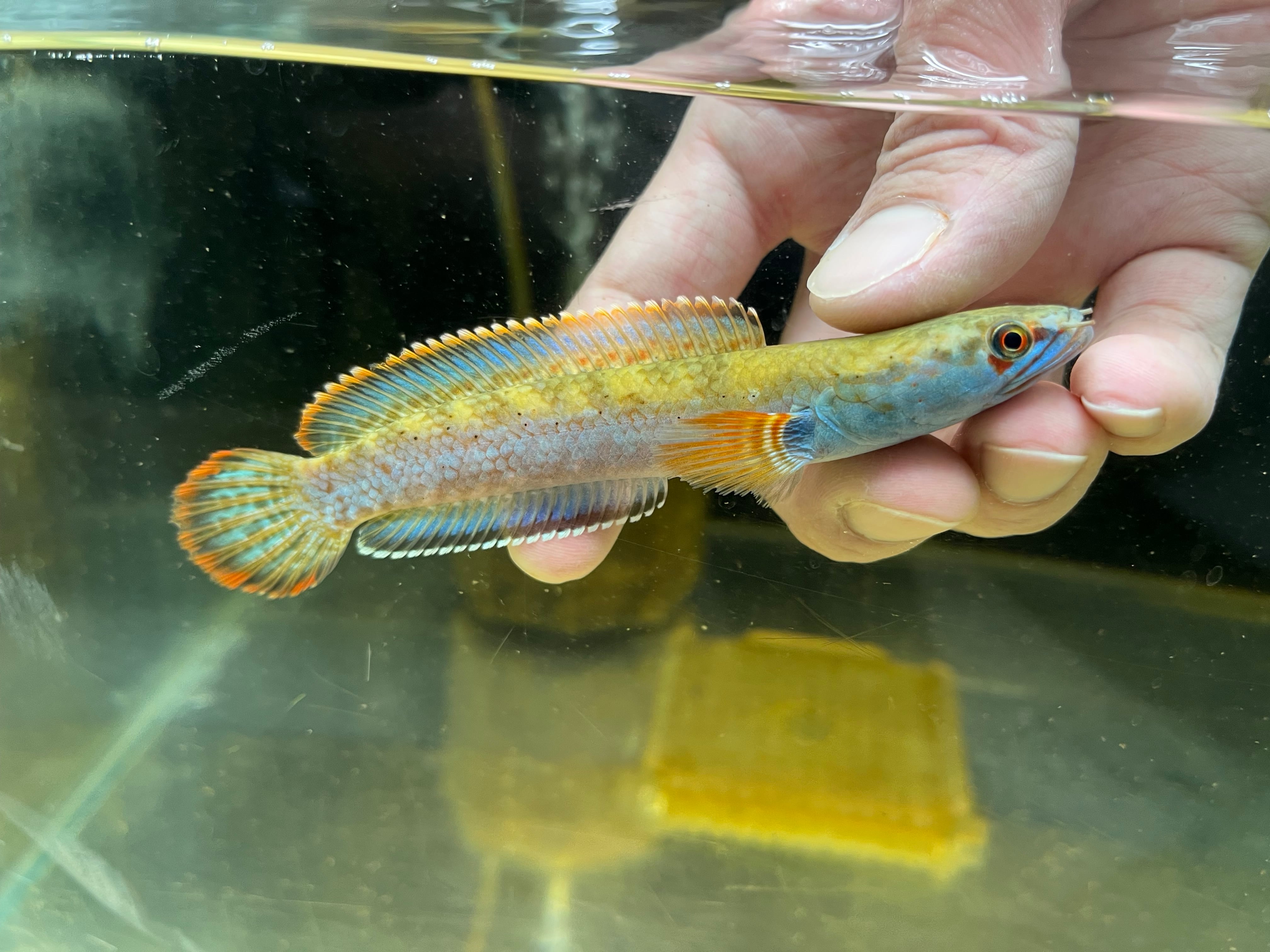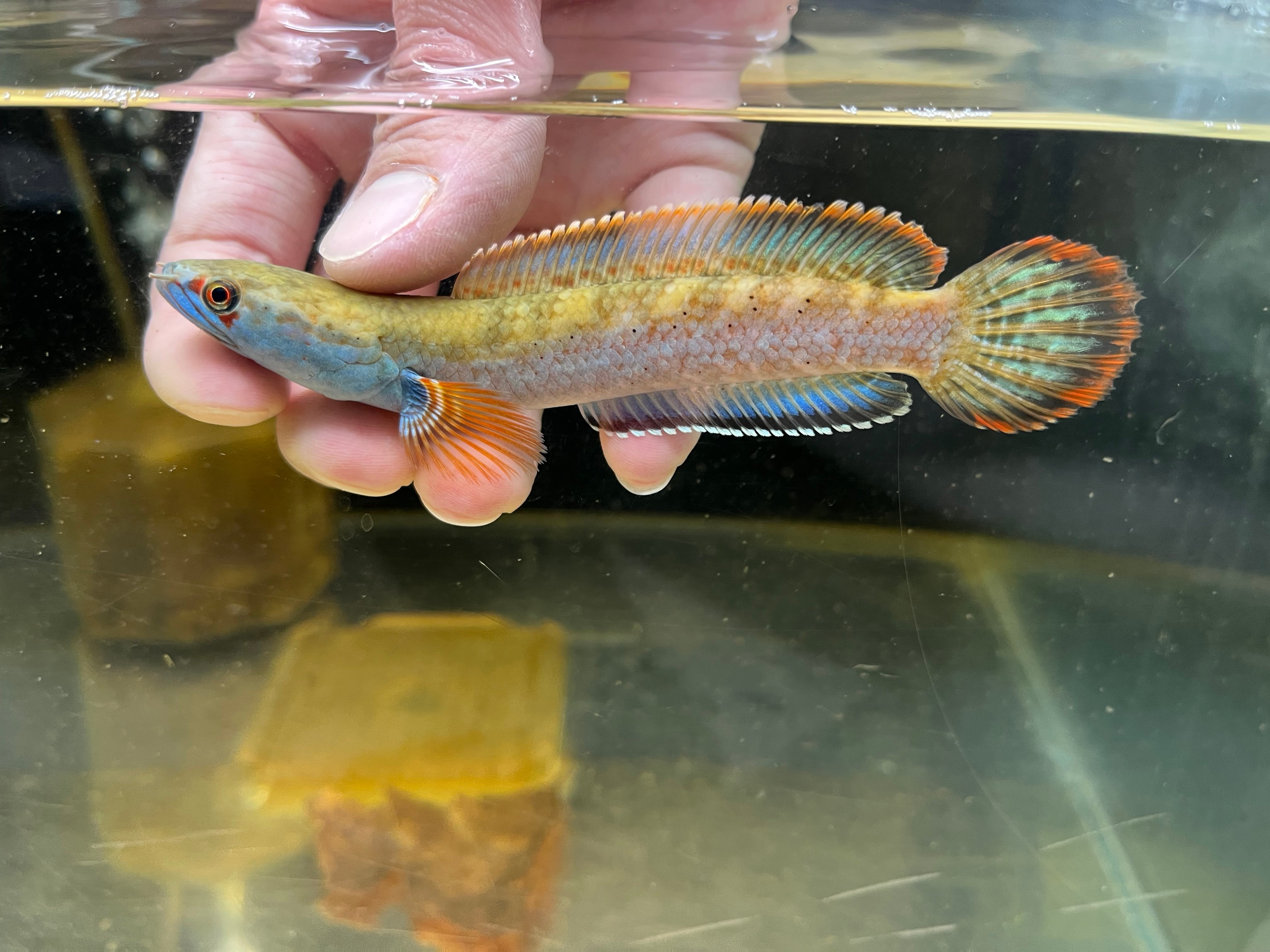 ミャンマーに生息するスネークヘッドです。ボディに入るメタリックブルーやヒレのオレンジエッジが美しく絶大な人気を誇るスネークヘッドです。また目の周りに入る赤い模様がカブキ役者の隈取に見えることからカブキの流通名もあります。発見から長らくsp種として扱われてきましが、近年の研究でチャンナフィロフタルムスと学名がつきました。