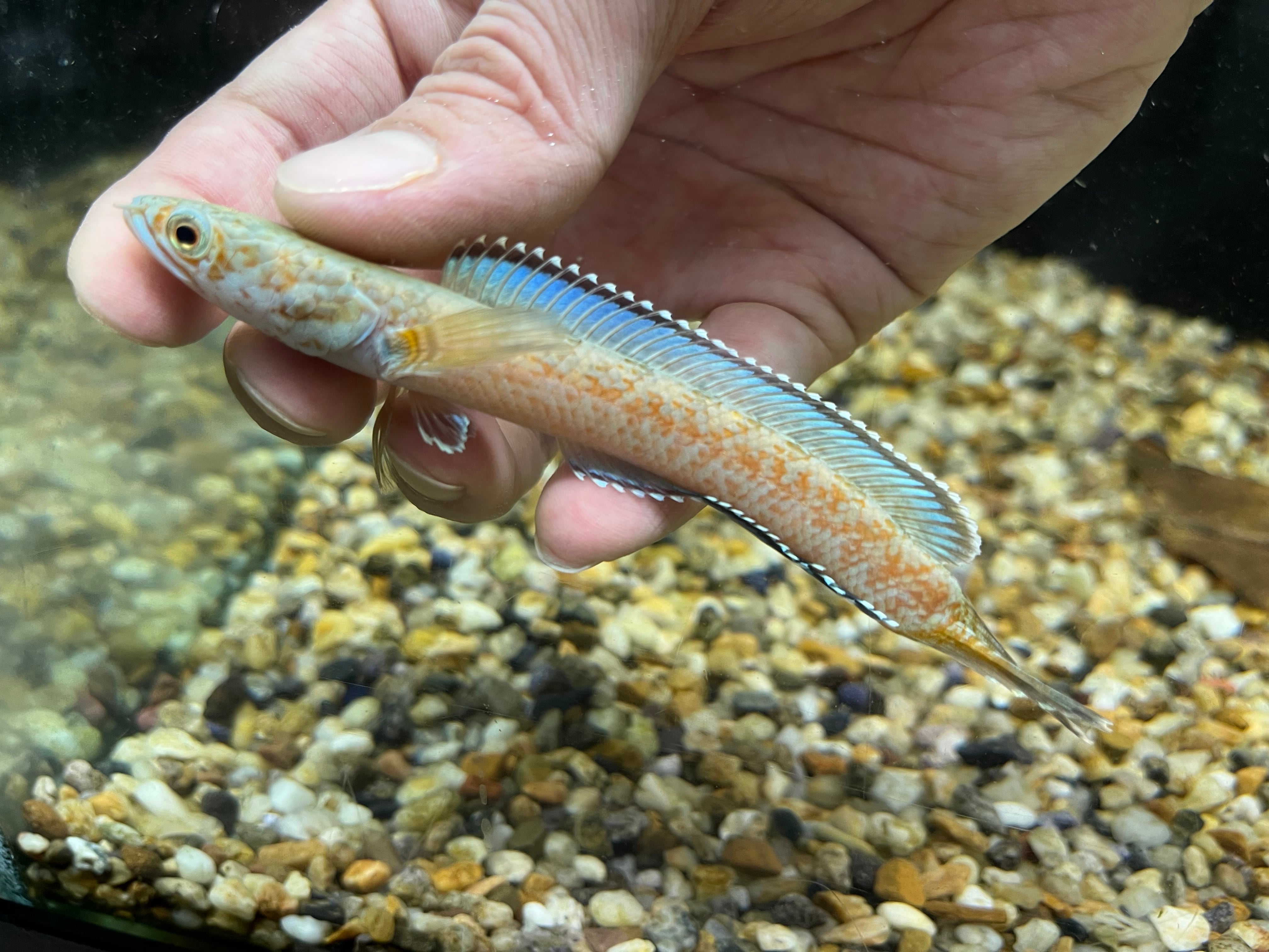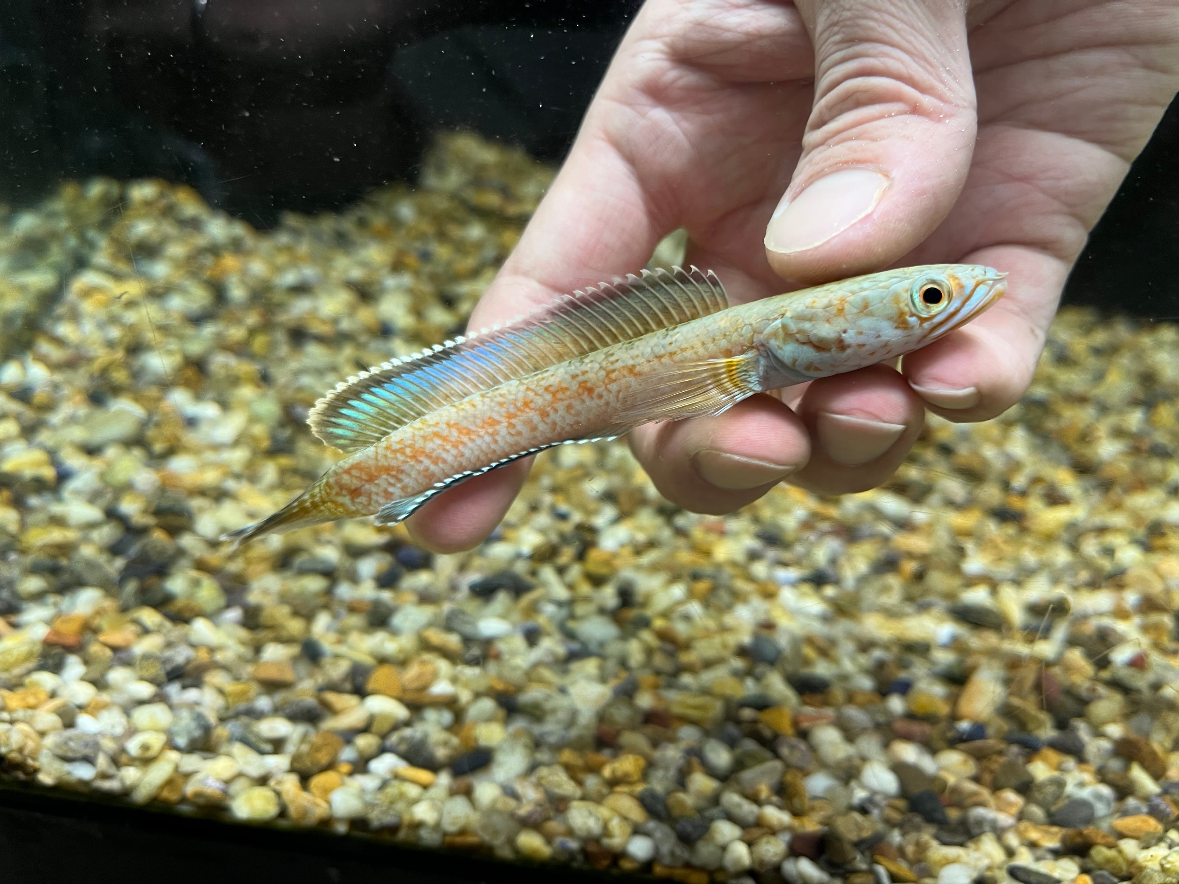 2020年に新種として記載されたアリストネイに次いで発見された青系スネークヘッドのsp種です。全体的な印象はアリストネイに非常によく似ますが、コンディションの良い本種はボディが金色に輝き、その姿が砂金をまぶしたように見える事からゴールドダスト(砂金)の名称がつけられました。