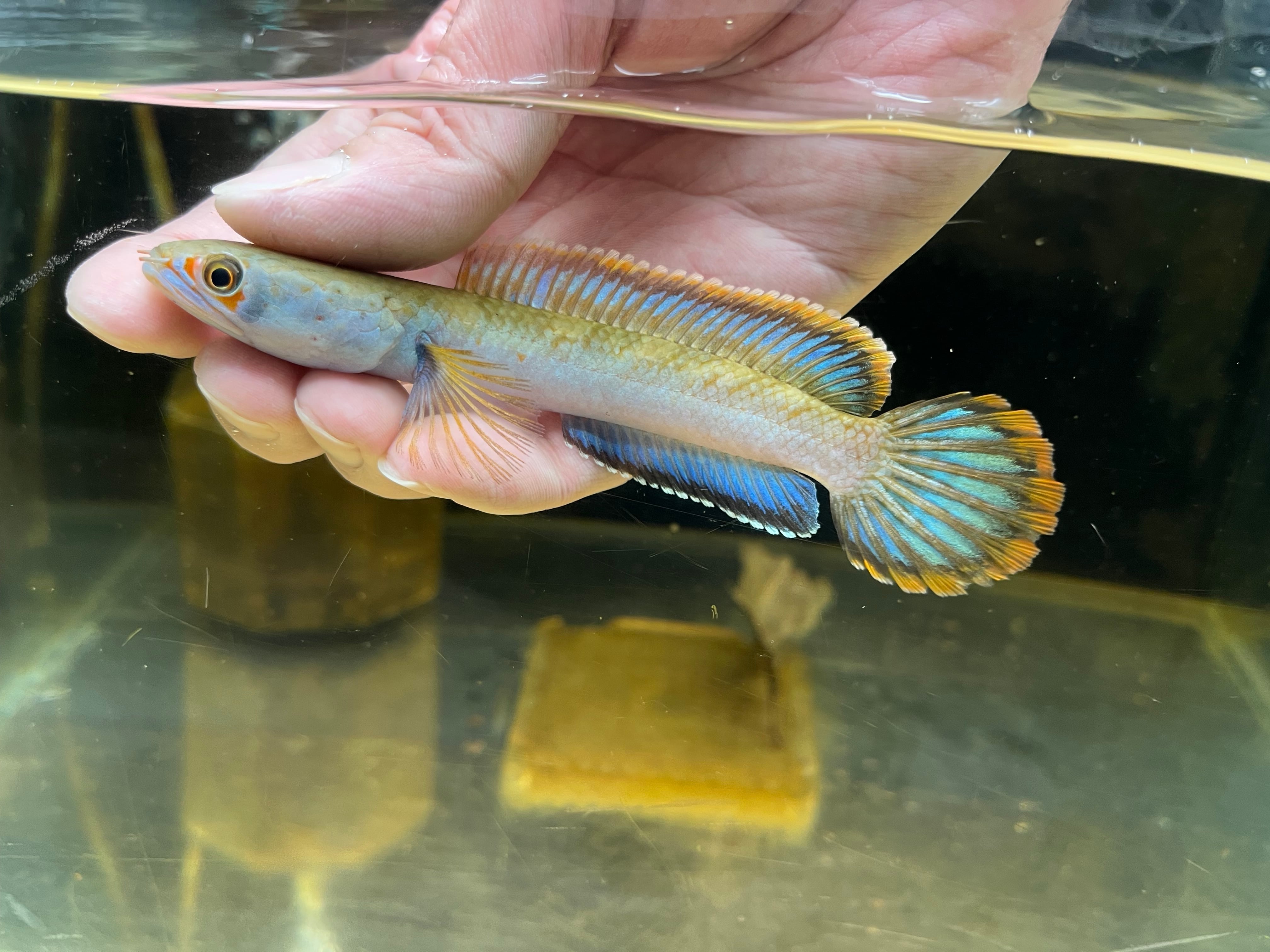 ミャンマーに生息するスネークヘッドです。ボディに入るメタリックブルーやヒレのオレンジエッジが美しく絶大な人気を誇るスネークヘッドです。また目の周りに入る赤い模様がカブキ役者の隈取に見えることからカブキの流通名もあります。発見から長らくsp種として扱われてきましが、近年の研究でチャンナフィロフタルムスと学名がつきました。