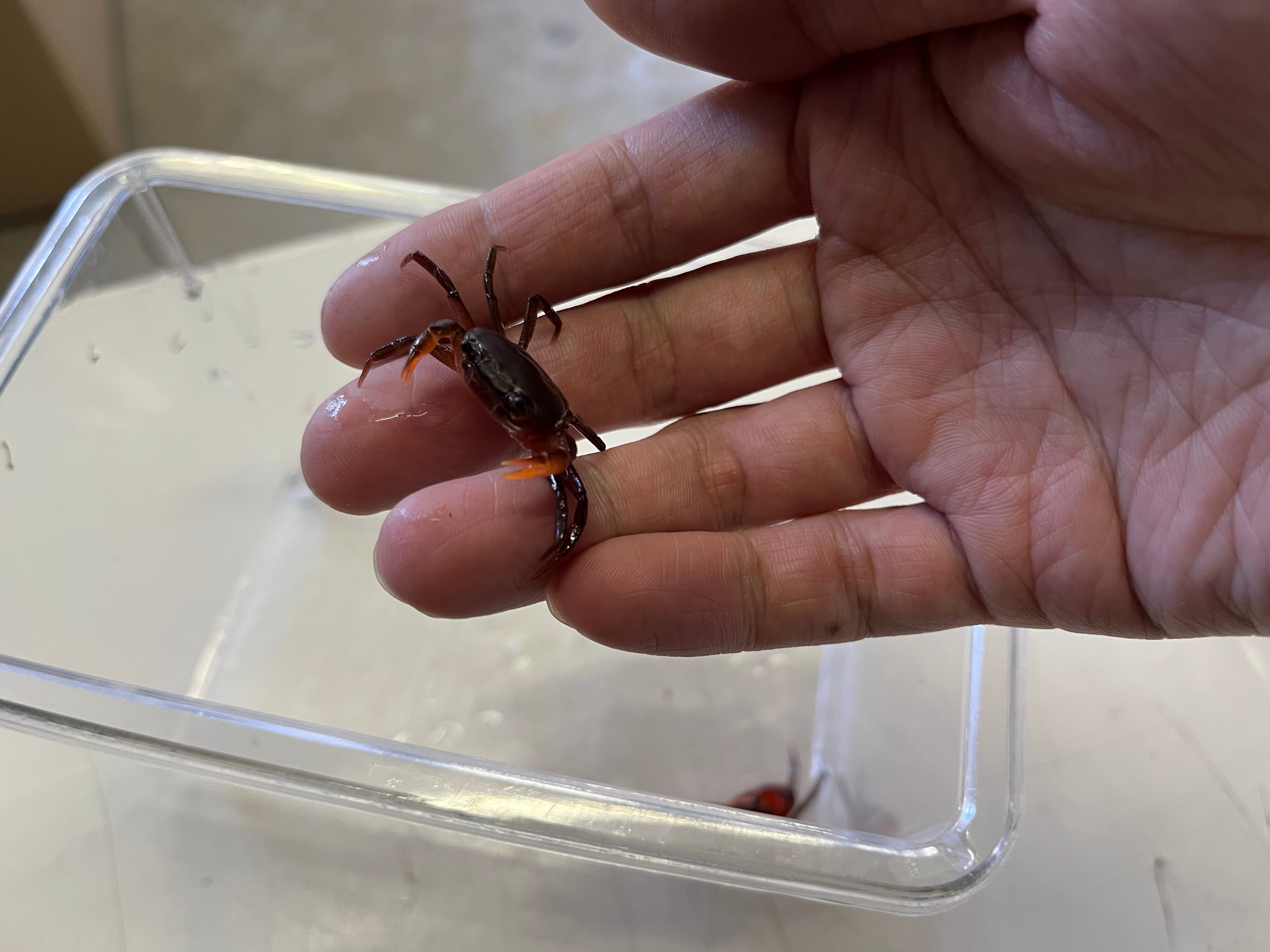 インドで比較的最近見つかったGhatiana属の一種と思われるカニです。全身ルビーの様に赤い甲羅をした美しいカニです。オスは片方のハサミが大きくなります。飼育は純淡水で問題ありませんが、水棲依存が高いため全身が浸かれる水場は必須です。オス1匹メス1匹のペア販売です。