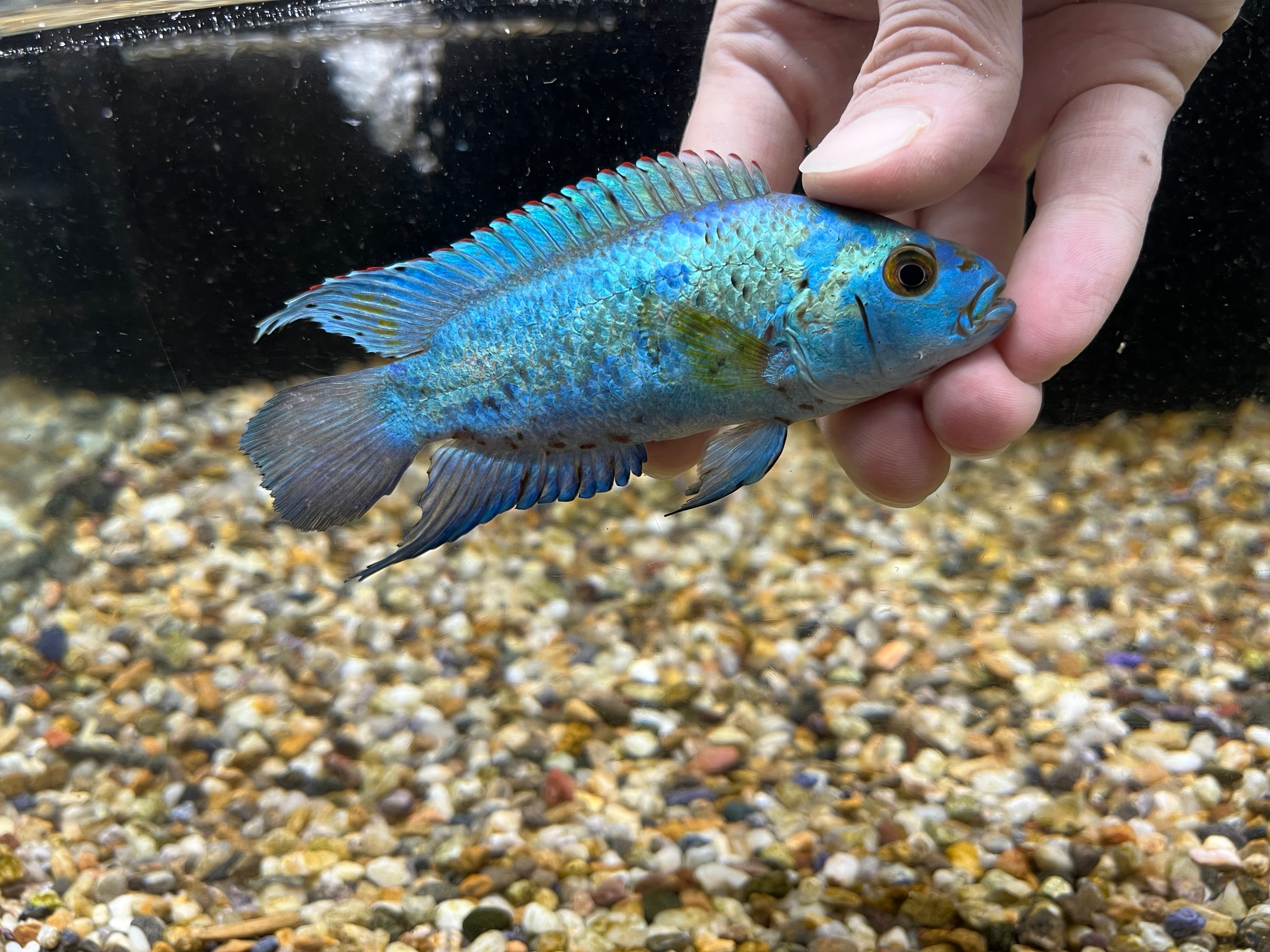 ジャックデンプシーの青みをより鮮やかに強く発色するようにした品種改良です。全身が鮮やかなターコイズブルーの体色に染まり美しい人気種です。
