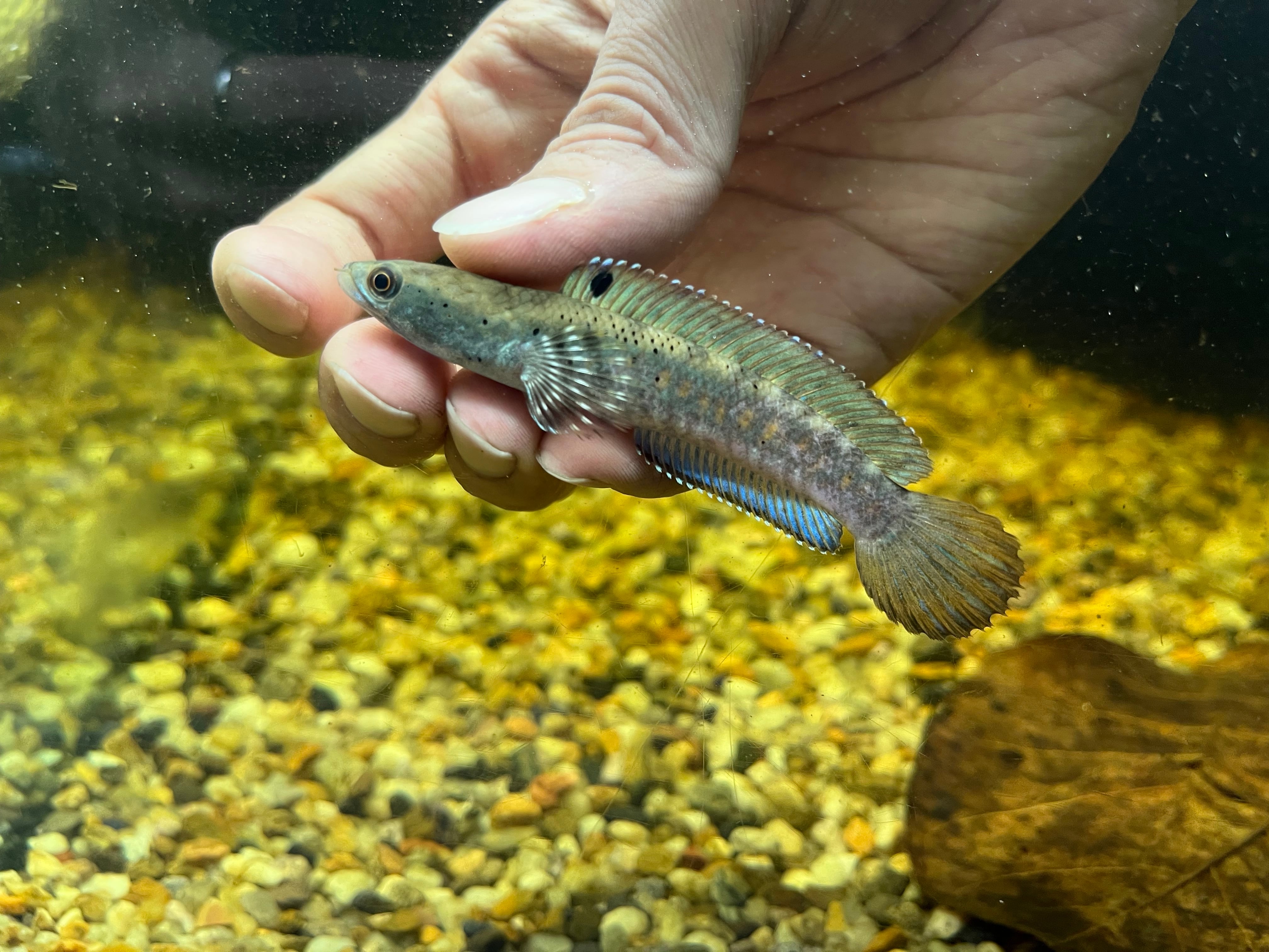 ミャンマーに生息するスネークヘッドですが、野生個体は珍しく現在流通するそのほとんどは東南アジアで養殖されたブリード個体です。成長に伴い青色に発色し美しくなります。